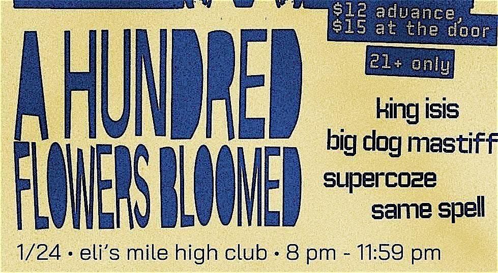 A Hundred Flowers Bloomed is a concert fundraiser for Community Liberation Programs to raise funds for their future center! Join us for a night filled with incredible performances from King Isis, Supercoze, Big Dog Mastiff, and Same Spell! CLP will be selling exclusive merch and tabling for folks who want to get involved! Masks Required and will be provided!