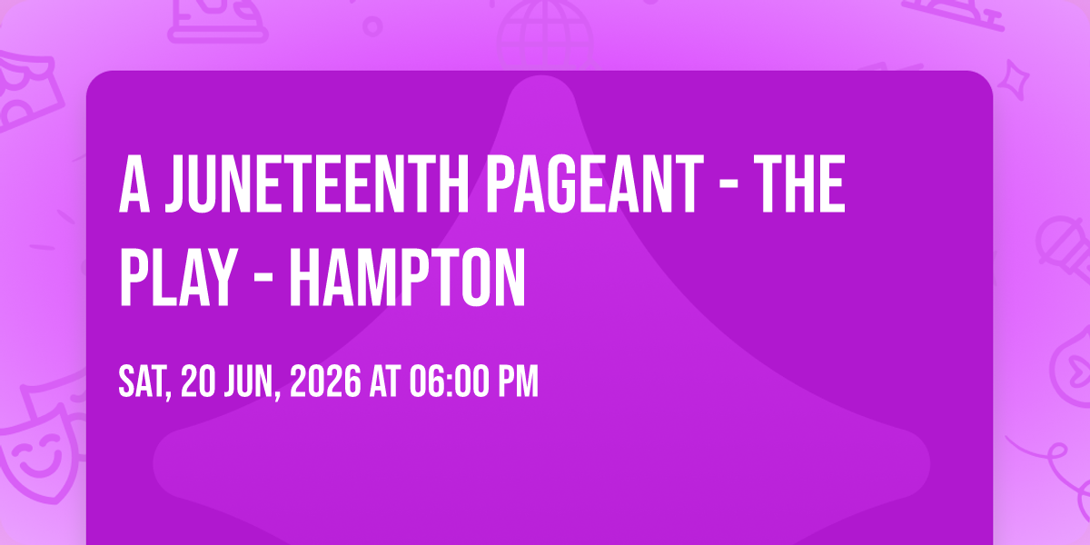 📍 Location: 37.0171, -76.3204✨ Enter a world of endless possibilities at A Juneteenth Pageant - The Play - Hampton, where every moment tells a story! 🏛️ The stunning The American Theatre - Hampton in vibrant Hampton, VA transforms into a realm of wonder on June 20th, 2026 at 06:00 PM. 🌟 They have crafted an experience that goes beyond the ordinary, combining elements of surprise, delight, and pure entertainment. Every detail has been thoughtfully considered to ensure your journey with us is nothing short of extraordinary. 🎯 Join fellow adventure seekers and memory makers in this celebration of imagination and innovation. 🎊 Reserve your spot today and be part of something truly special!