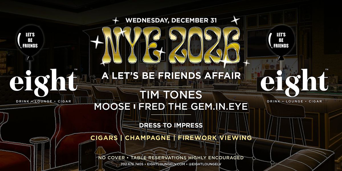 Let's Be Friends Party is ringing in the new year in the most classy way possible - a dress to impress event at Eight Lounge! Eight Lounge is a classy venue - so we are encouraging our LBF fam to dress to the nines on this one and celebrate with quality champs while watching the NYE fireworks from the spacious Eight Lounge patio. You know our vibes - immaculate rnb driven sounds all night provided by Tim Tones, OG Moose and Fred the Gem.In.Eye.