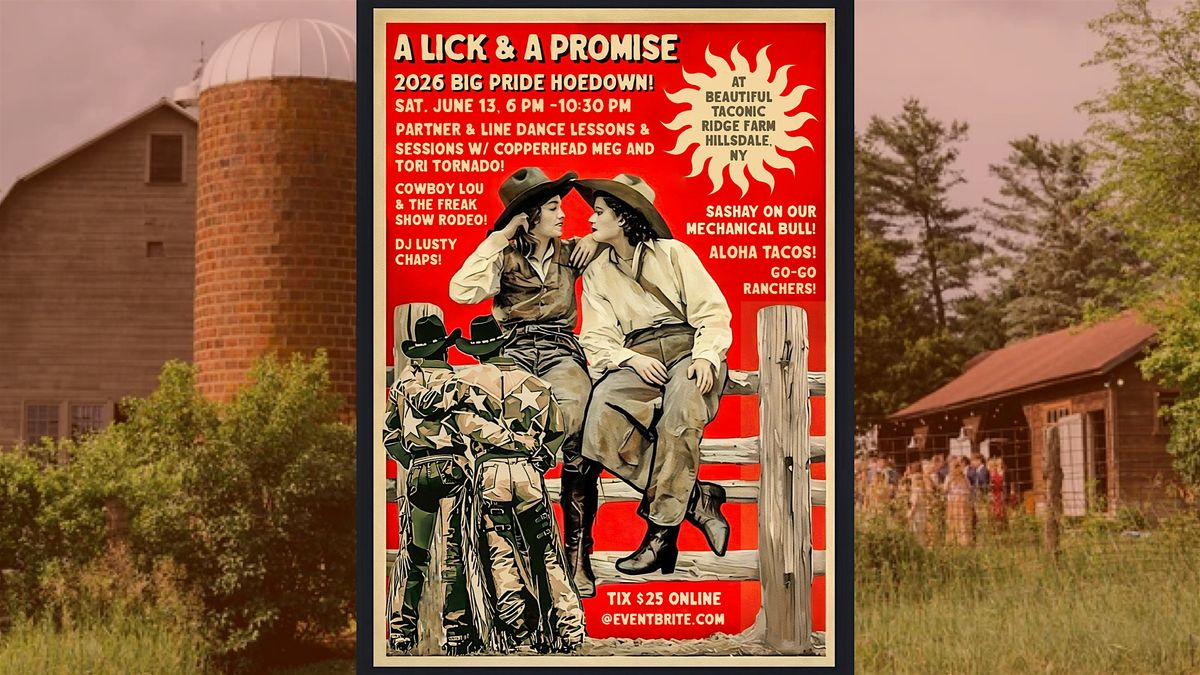 Shire 935 Events and are joining forces to produce an epic LGBTQ+ pride hoedown, A Lick & A Promise: Big Pride Hoedown 2026, this coming June in Hillsdale, NY; an action-packed celebration of community, diversity, and country-western flair! So far, the event will include a mechanical bull, partner & line-dancing lessons with & , drag performances by and the region’s newest creative collective . Also on tap will be Go-Go Ranch Dancers, queer country DJs, a big seated fire pit, a beer and wine saloon, and a delicious menu of options from in a fabulous rodeo setting upstate at Taconic Ridge Farm in Columbia County, NY.