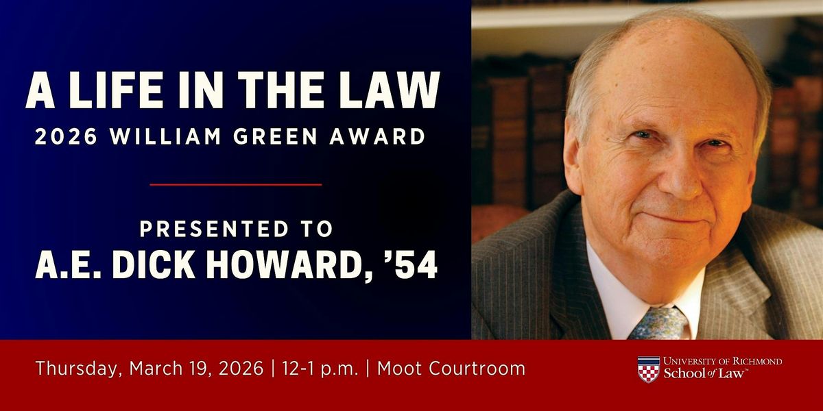 Join us on Thursday, March 19, as Richmond Law presents the 2026 William Green Award for Professional Excellence to A.E. Dick Howard, '54. Howard is the Warner-Booker Distinguished Professor of International Law Emeritus at UVA Law and a nationally renowned constitutional scholar. He has been recognized by Washingtonian as one of the nation’s most respected educators and by the Richmond Times-Dispatch and Library of Virginia as one of the “greatest Virginians” of the 20th century.