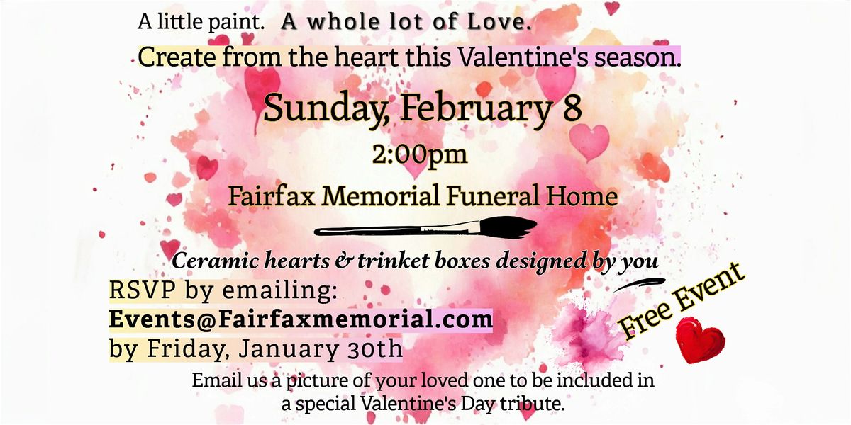 Paint & decorate ceramic hearts or trinket boxes-- your choice. Put your creative cap on and grab a paintbrush on the 8th of February at 2:00pm at Fairfax Memorial Funeral Home (9902 Braddock Rd, Fairfax VA 22032).