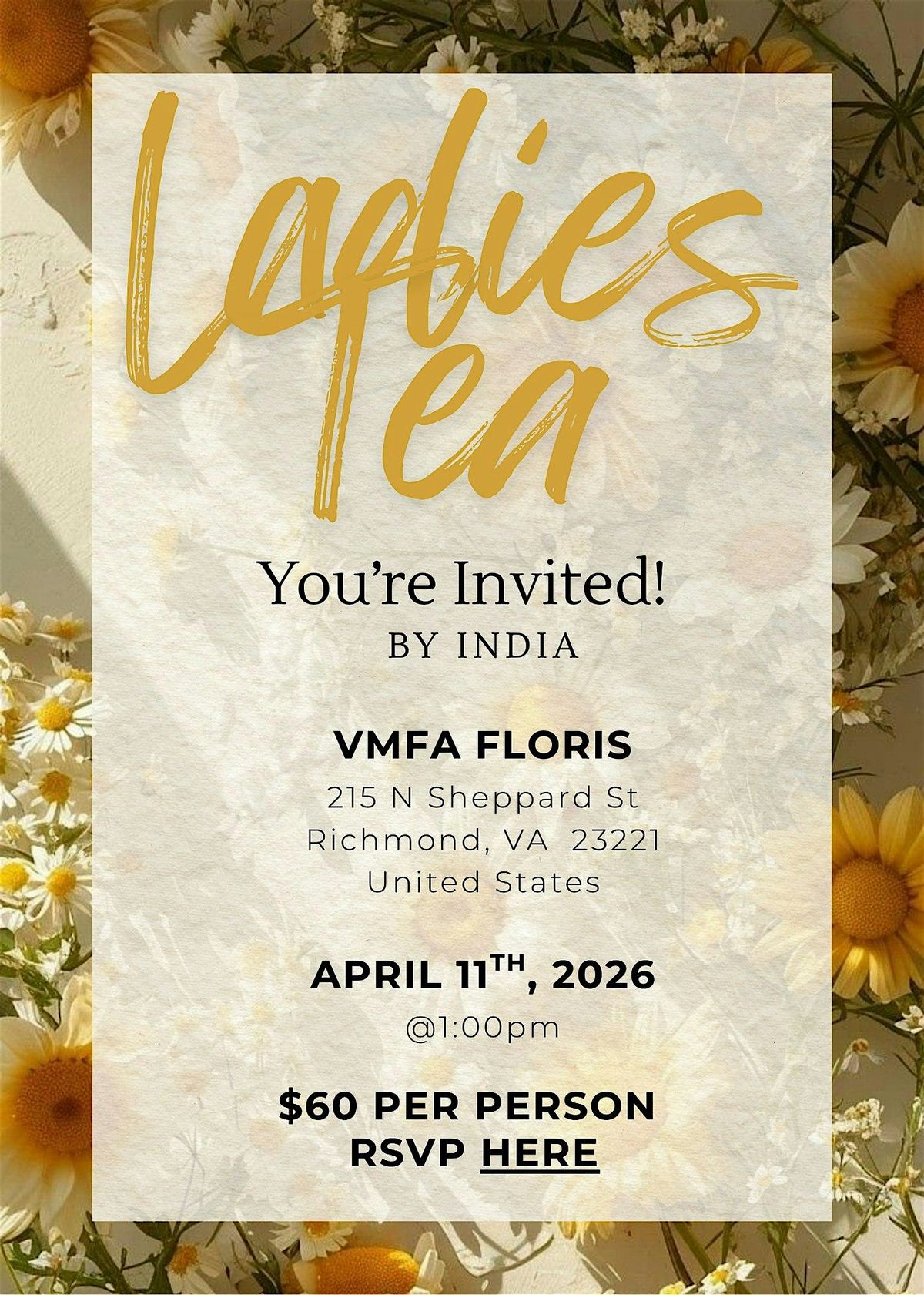 Hey there! Ready for a splendid afternoon? Come dress up, sip some tea, nibble on tasty treats, and enjoy great company at our in-person gathering. It's all about relaxing and having fun with fellow lovely ladies. Don't miss out on this charming event that's sure to warm your heart, and make new friends!