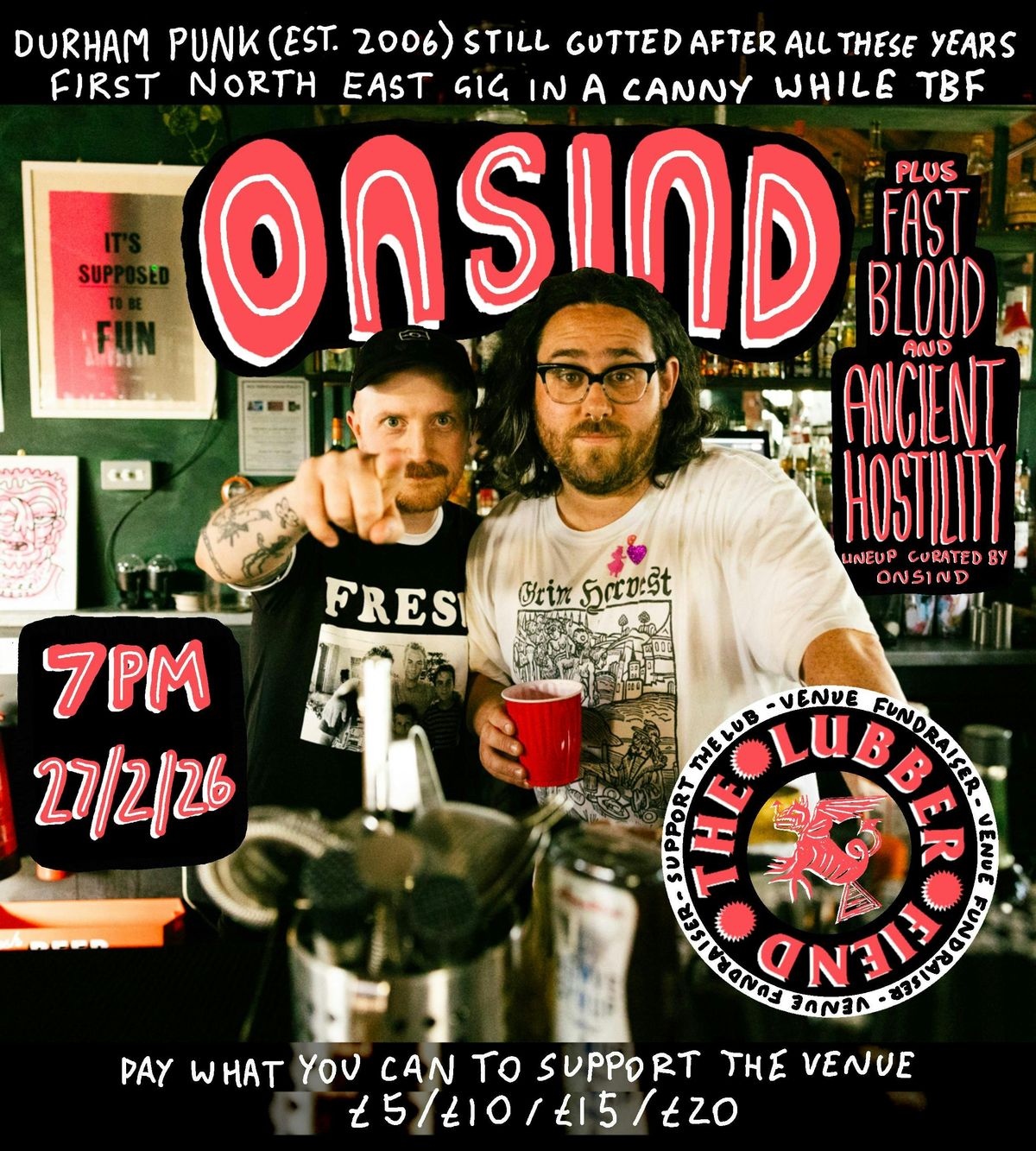 We're excited to announce the first in a series of artist-curated fundraisers for the venue:Our inaugural event is curated by Durham folk-punk legends ONSIND!Friends of the venue ONSIND (members of Martha/Nathy SG), established in 2006 (like the Securitas Depot Robbery), have been playing their signature brand of introspective, morally conscious, anti-fascist punk for nearly twenty years. They will be performing in their full band iteration, so expect raucous sing-alongs and disco grooves from the rhythm section - this will likely be your only chance to see them in 2026. Do not miss out.ONSIND have invited locals Fast Blood (members of Fortitude Valley/Voorhees), and Liverpool's Ancient Hostility (formerly of Dawn Ray'd/All in Vain) to complete the line-up.Fast Blood - kinetic, soulful, melodic NE punk rock for lovers. Huge riffs and pummelling rhythms inspired by Hot Snakes & Pretty Girls Make Graves - political anthems with razor-sharp lyrics. Ancient Hostility - displaying the power of restraint and minimalism, sparing use of violin/concertina and vocal harmonies that hit like a sledge-hammer, AH effortlessly fluctuate between beauty & righteous anger.