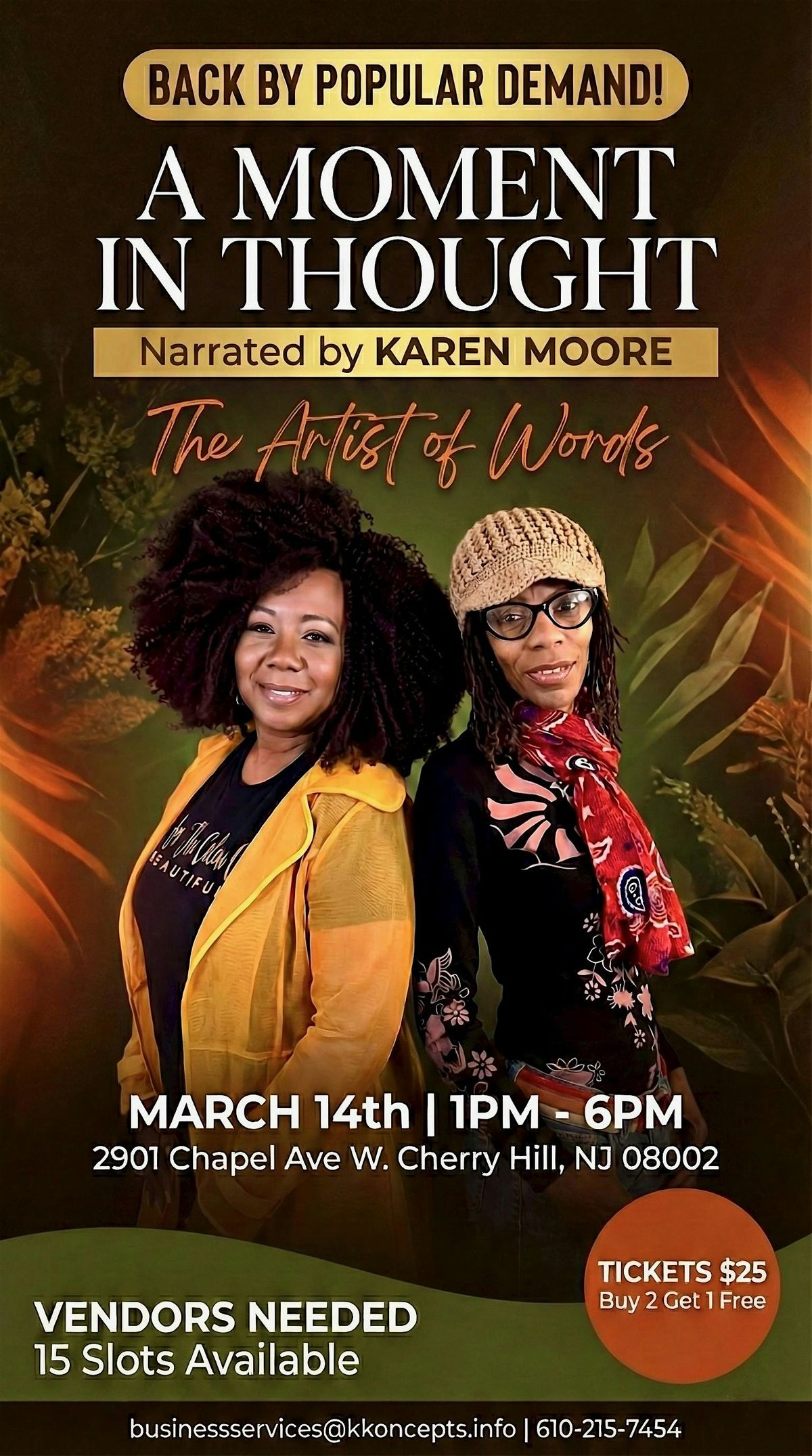 Join us in person to watch, A Moment in Thought, a play that highlights a woman's ability to move from brokeness to bondage from bondage to freedom. An experience many people can relate to. The Artist of Words, poetically captivates her audience guiding them through her journey of healing, self love, preservation and restoration of the beauty and strength of a woman. This depiction is to help others who may have had similar experiences.In addition to this amazing play this event offers a mini EXPO, there will be someting for everyone to enjoy. You can dive deep into ideas and connect with others. Bring your curiosity and a open-mind. Whether you’re looking to reflect, discuss, or simply enjoy the vibe, this is your spot. Don’t miss out on this unique day of togetherness.