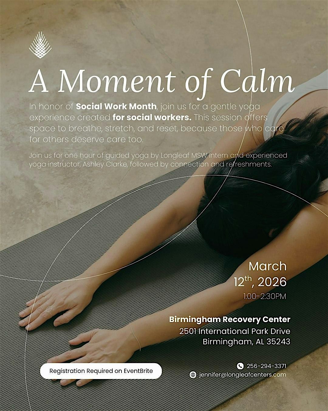 This event includes a one-hour guided yoga session led by Ashley Clarke, Longleaf MSW Intern and experienced yoga instructor. The practice will incorporate gentle movement, breathwork, and mindfulness, with options to modify throughout to make it accessible to all experience levels.