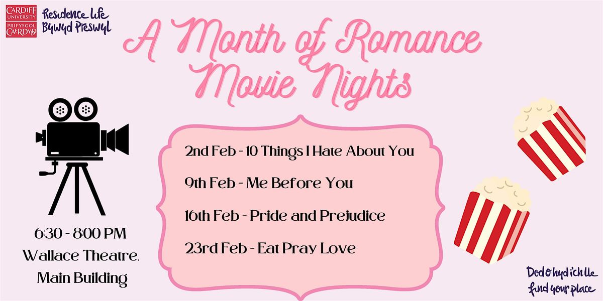Byddwn yn dangos ystod o ffilmiau dros y pedair wythnos, o 10 Pethau Rwy'n Casáu Yn Eich Cyfer i Bwyta, Gweddïo, Cariad, mae gennym gyfuniad o dragödïau rhamantus a chomedïau felly mae rhywbeth i bawb. Bydd diodydd a byrbrydau ar gael, felly dim ond dewch yn syml a mwynhewch! Mae Neuadd Darlithio Wallace ar ochr chwith y prif adeilad. Dilynwch y syniadau o'r brif dderbynfa.