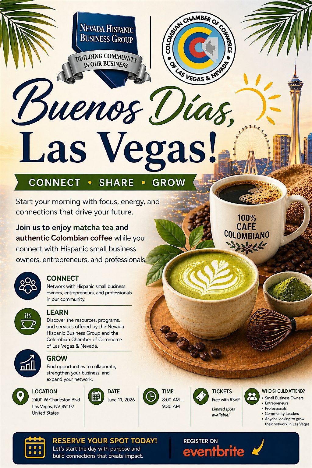 Enjoy a unique blend of matcha tea 🍵 and authentic Colombian coffee ☕ while connecting with like-minded individuals who are building and growing businesses in our community.