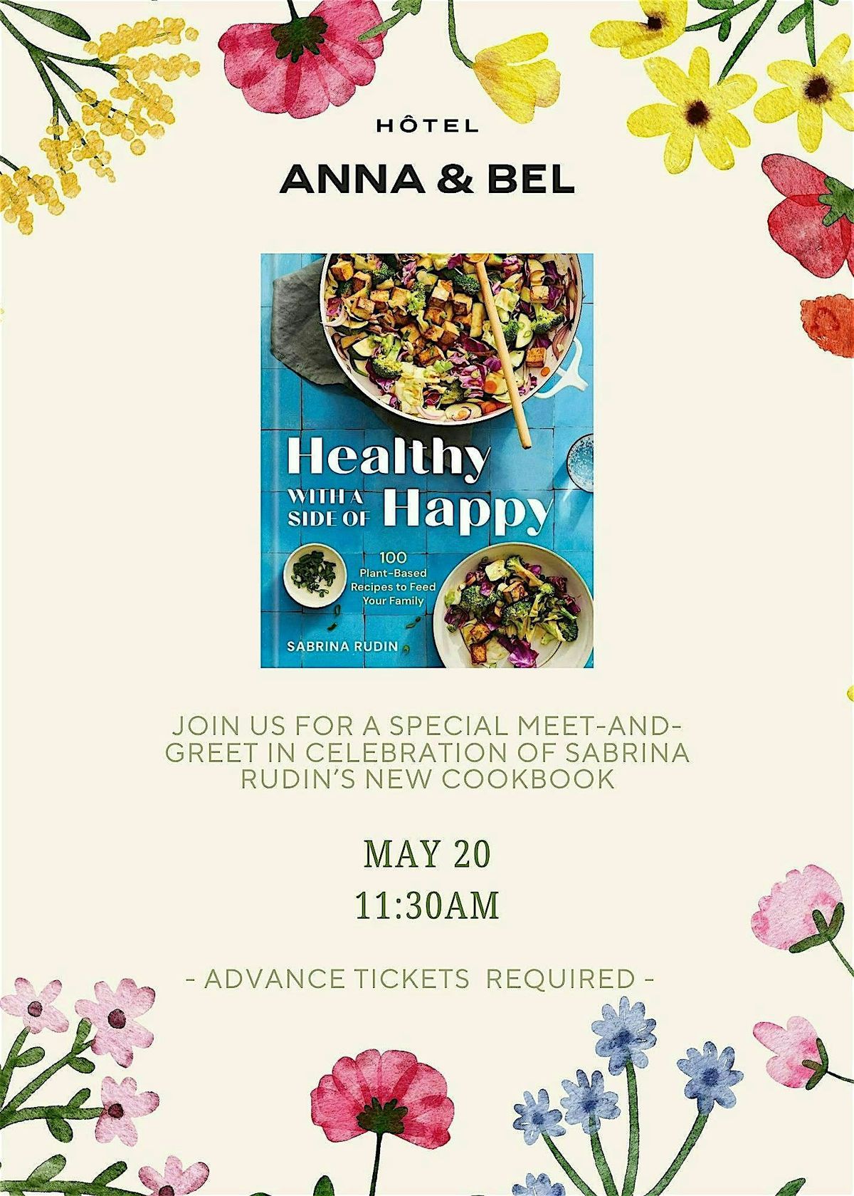 Books will be provided by local culinary bookstore . We recommend reserving your copy of Healthy with a Side of Happy for Sabrina to sign by pre-ordering . Guests who pre-order can pick up their books at Hotel Anna & Bel on event day. A limited number of additional copies will be available for purchase at the event on a first-come, first-served basis.