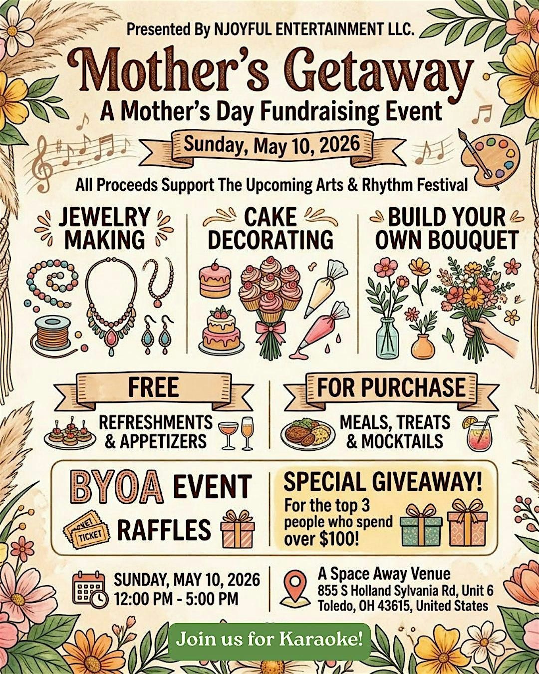 Mother’s Day getaway: jewelry making, cake decorating, bouquet building & karaoke—supporting the upcoming Arts & Rhythm Festival fundraiser.