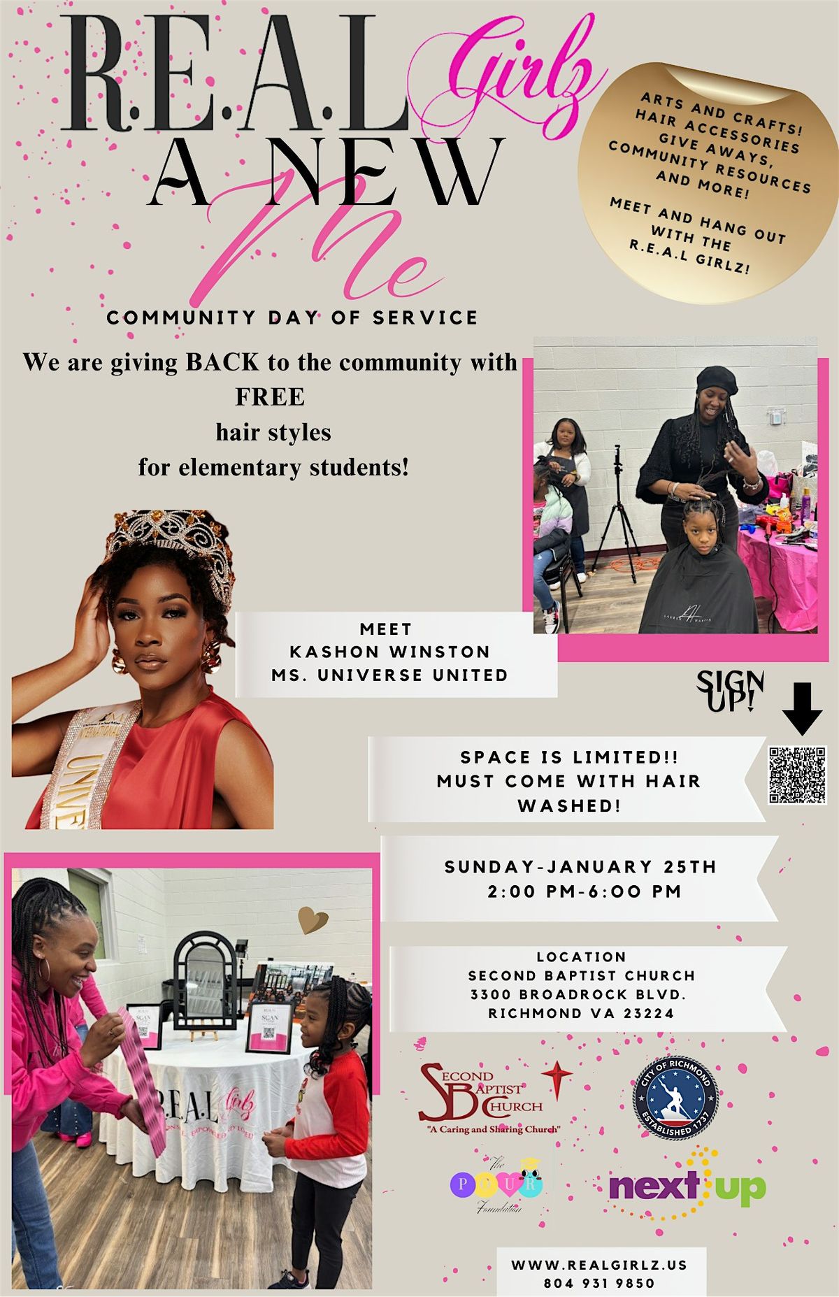 Join us for our 2nd annual event where we're giving away free hairstyles to elementary shcool girlz! ! It's all about community and we would love for you to join us. Meet Ms. Kashun Winston, Ms Universe United, participate in arts and crafts, get some R.E.A.L Girlz Sway and most important meet the R.E.A.L Girlz!