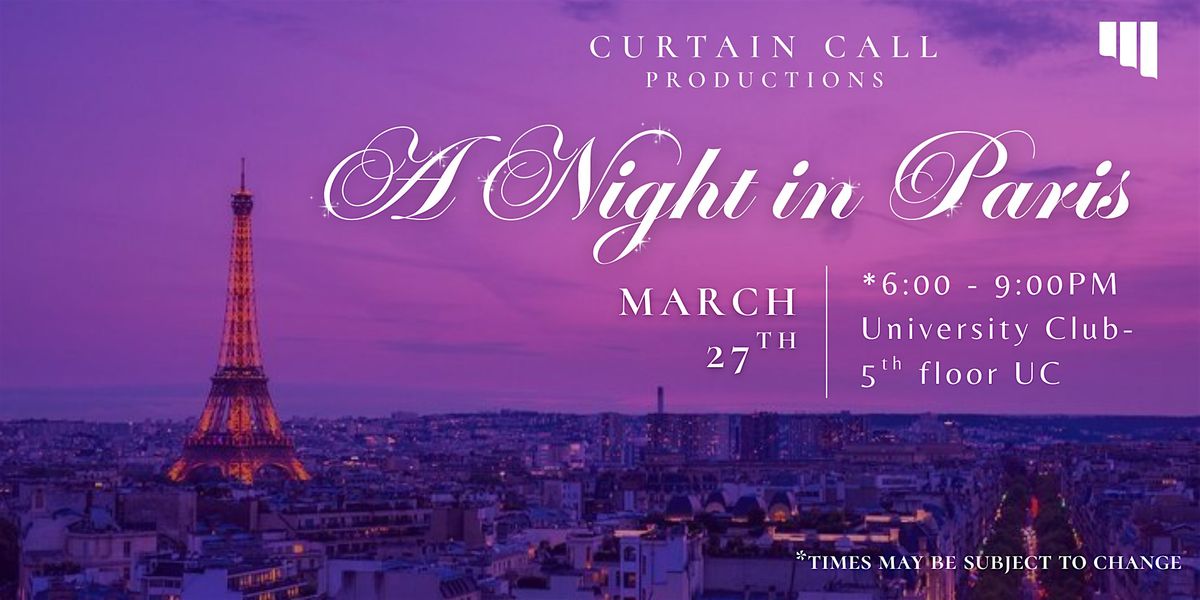 Join us for a spectacular 'Night in Paris' at Curtain Call Productions End-of-Year Gala, a night dedicated to celebrating the incredible talent, dedication, and passion that brought our production of Anastasia to life! This special event is not only a tribute to our show but also a recognition of the hard work and commitment of every member who makes this club truly extraordinary.