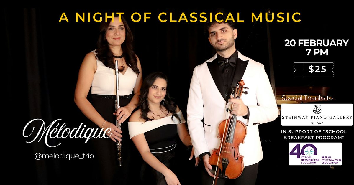 Join us for an enchanting evening of classical music featuring the exceptional Trio Mélodique! Tickets are just $25.00, with all proceeds going towards the School Breakfast Program, supported by the Ottawa Network for Education. This vital initiative ensures that children in our community start each school day nourished and ready to learn.