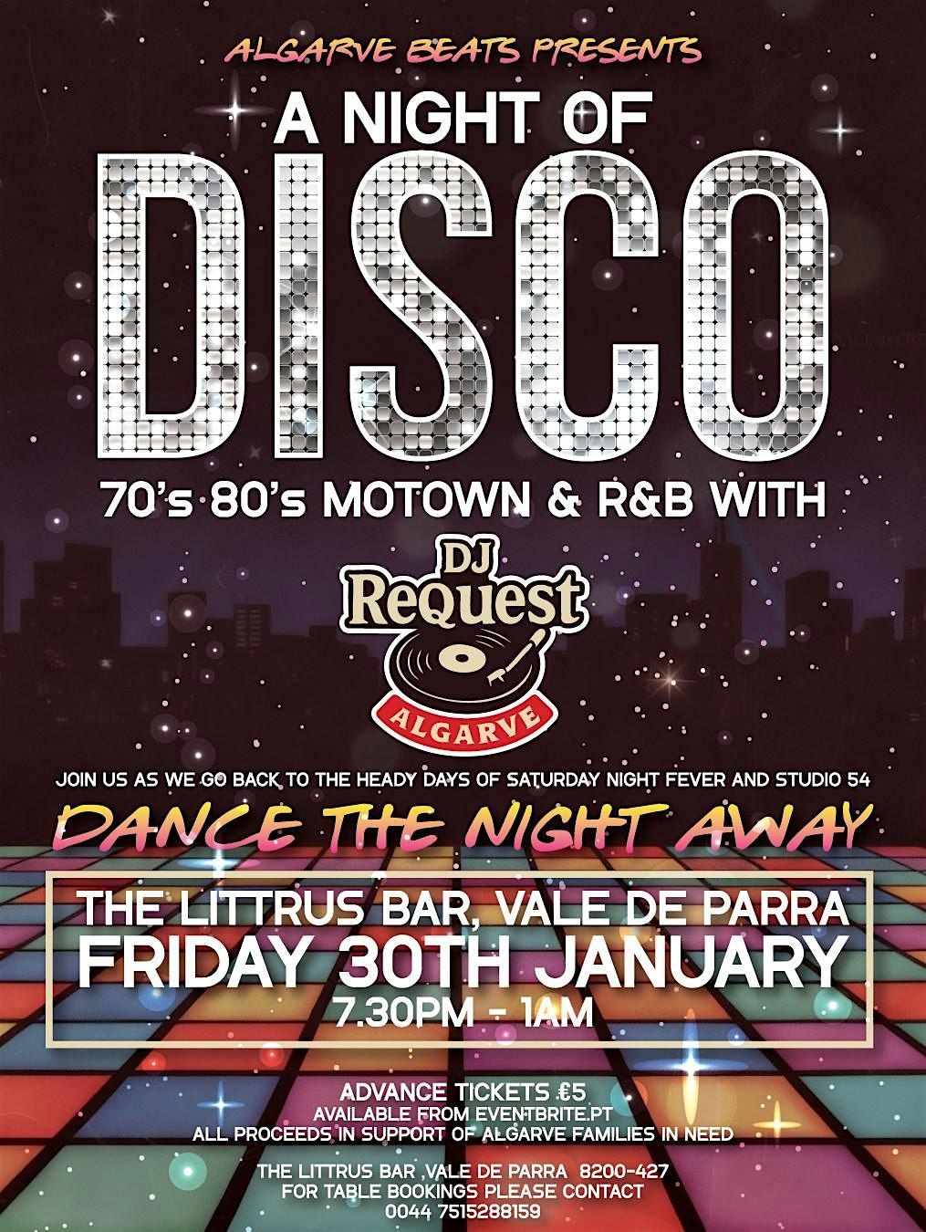 Algarve Beats presents A Night of Disco: 70's 80's Motown & R&B with DJ ReQuest. Join us as we go back to the heady days of Saturday Night Fever and Studio 54.