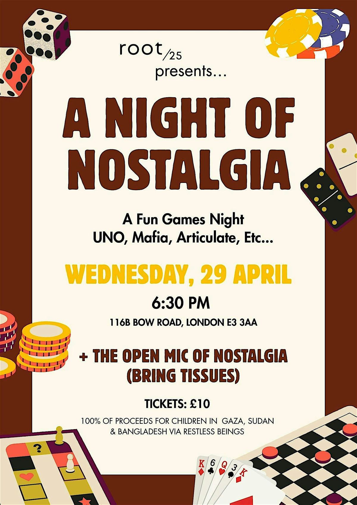 Step into a night where childhood comes rushing back. 'A Night of Nostalgia' is all about rediscovering the simple joy of the games we grew up loving—laughter over cards, playful (or not-so-playful) competition, and those moments that made growing up so special. Expect a relaxed, feel-good evening filled with classic games, familiar songs, and comforting snacks that take you right back. There’ll be a chance to pause midway, share old stories, and reconnect with the carefree spirit of youth, before diving back into the fun with friends old and new. Expect a games night; leave, remembering the lightness of childhood 😊