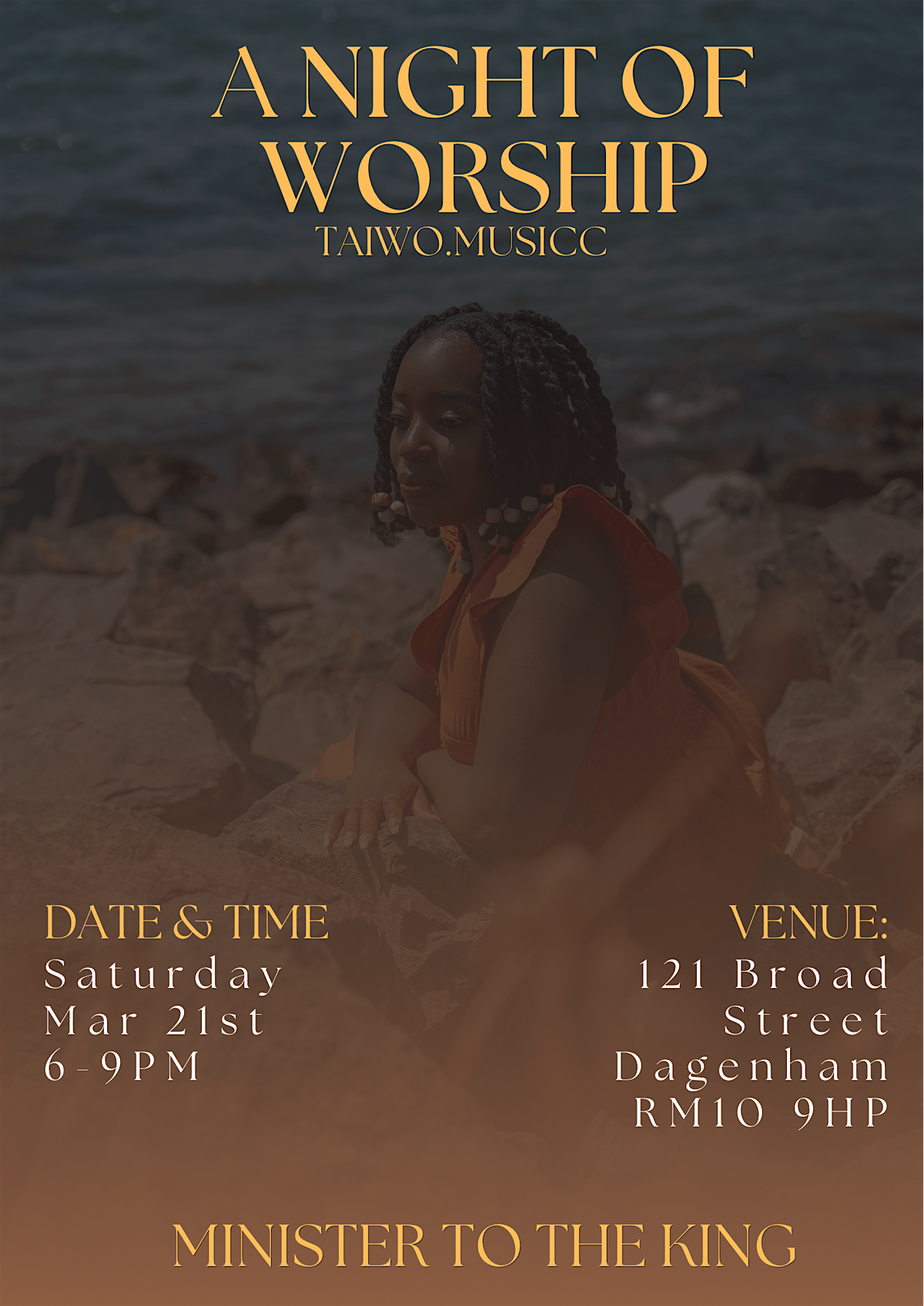 Prepare your heart for an intimate evening of praise and worship unto God where our focus is to minister to our King. This will be a powerful night filled with uplifting songs and heartfelt moments. It's all about being still in his presence, God enjoying our worship as we give him the worship he demands. Don’t miss out on this special night, and why not bring a friend our two?