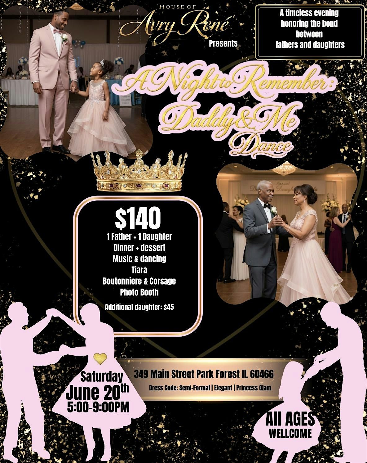 A Night to Remember: Daddy & Me is a heartfelt, elegant father-daughter dance created to celebrate the special bond between fathers and their daughters. Hosted by House of Avry René, this community-focused event is designed to bring families together for an evening filled with love, connection, and unforgettable memories.