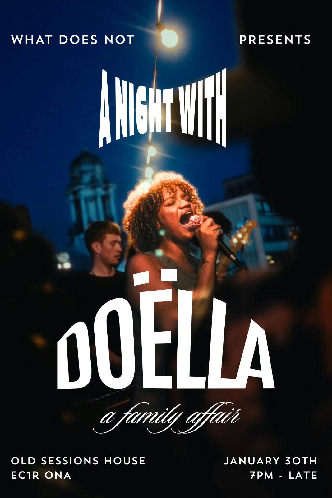 ✨ ABOUT THE EVENTWhat Does Not Presents, DOËLLA for a special headline show bringing her band back together for a long overdue night of live music, community, and celebration.A name you'll tell people, ‘we saw her when she was starting out,' this show marks a powerful moment: a return to the stage with her 6-piece jazz band, new music on the horizon — all within an opulent space designed to spoil the senses and set the tone for a 2026 full of good vibes ✨The sonic lovechild of Nina Simone, Amy Winehouse, Jill Scott, Sade and Erykah Badu, her music is laced with bossa nova, reggae and neo-soul, while being deeply jazz-inspired. As a performer she could sing the alphabet and it would be captivating, vocal powerhouse Doëlla and a roster of her nearest and dearest promise to deliver otherworldly vocals, soulful groove-led arrangements, and a room full of people who just get it.Brought to you by What Does Not, a culture and experience agency all about human connection — and supporting the best independent talent from across London and beyond.