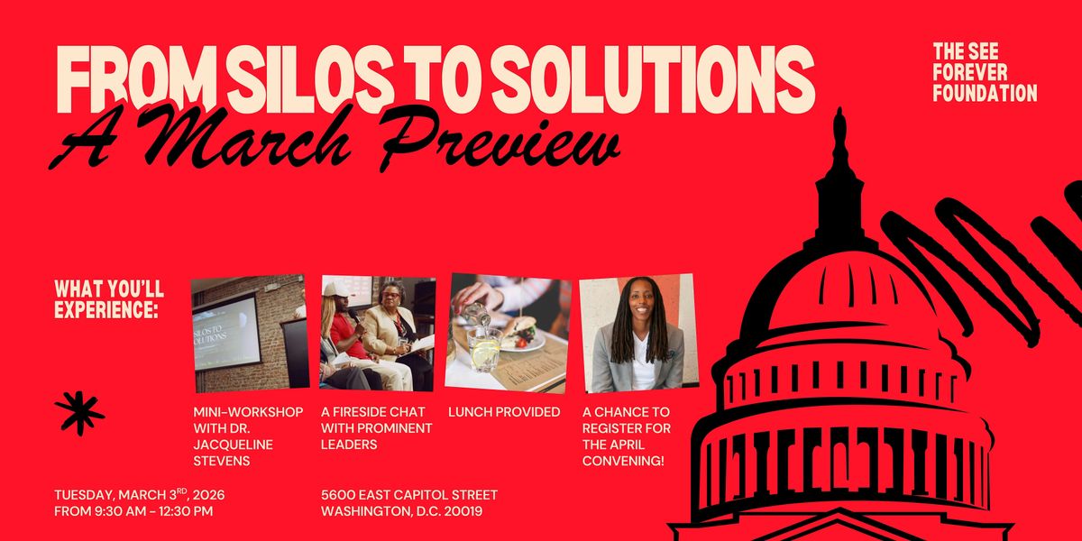 Join us on March 3, 2026 at 9:30 AM (Eastern Time) for a casual, in-person event at 5600 East Capitol St NE. It's a great chance to get a sneak peek into the exciting ideas behind "From Silos to Solutions: 2026". Come hang out, learn, and connect with others interested in making real change. Donβt miss out on this relaxed and insightful morning! We'll have a mini-workshop, a fireside chat with prominent leaders, and lunch will be provided.