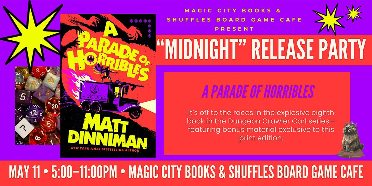 Magic City Books and Shuffles Board Game Cafe are so excited to announce our "midnight" release party celebrating book #8 in the Dungeon Crawler Carl series, "A Parade of Horribles."