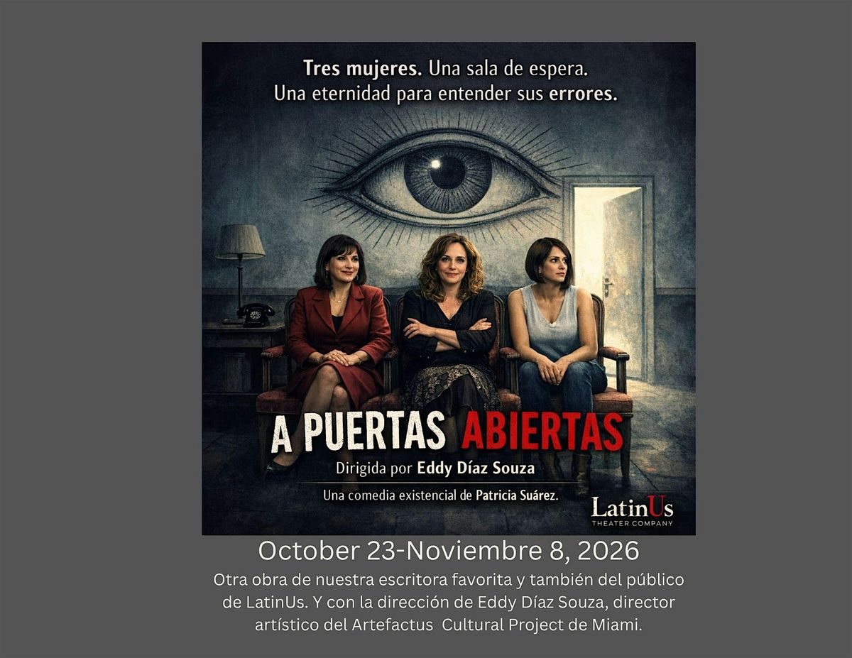 Patricia Suárez's Open Doors transports us to an unexpected hell: not of fire and brimstone, but of routines, guilt, and unresolved issues. In a peculiar reading room, Orietta, a strict school principal, and Ulrike, an actress who insists on being recognized as such, coexist. Both are serving punishments under the watchful eye of Dr. Recayente, an ophthalmologist tasked with examining their eyes and assigning them readings as part of their sentence. The monotony of this intellectual purgatory is disrupted by the arrival of Marina, a woman who made a suicide pact with her lover… but whose plan didn't go as expected. Three women, three generations, one shared hell. Amidst tension, irony, and confessions, the decisions that led them there will be revealed. Loosely inspired by Jean-Paul Sartre's No Exit, Suárez twists the existentialist premise and infuses it with biting humor and absurd situations that disarm the solemnity of eternal punishment. In this space, mysterious opportunities arise: “Open doors to reincarnation.” The possibility of returning to Earth brings into play something deeper than the desire to escape. Is it really better to return? What does it mean to leave hell behind… or to remain in it? With intelligence, irony, and a profoundly human perspective, Open Doors transforms damnation into comedy and eternity into a second chance.