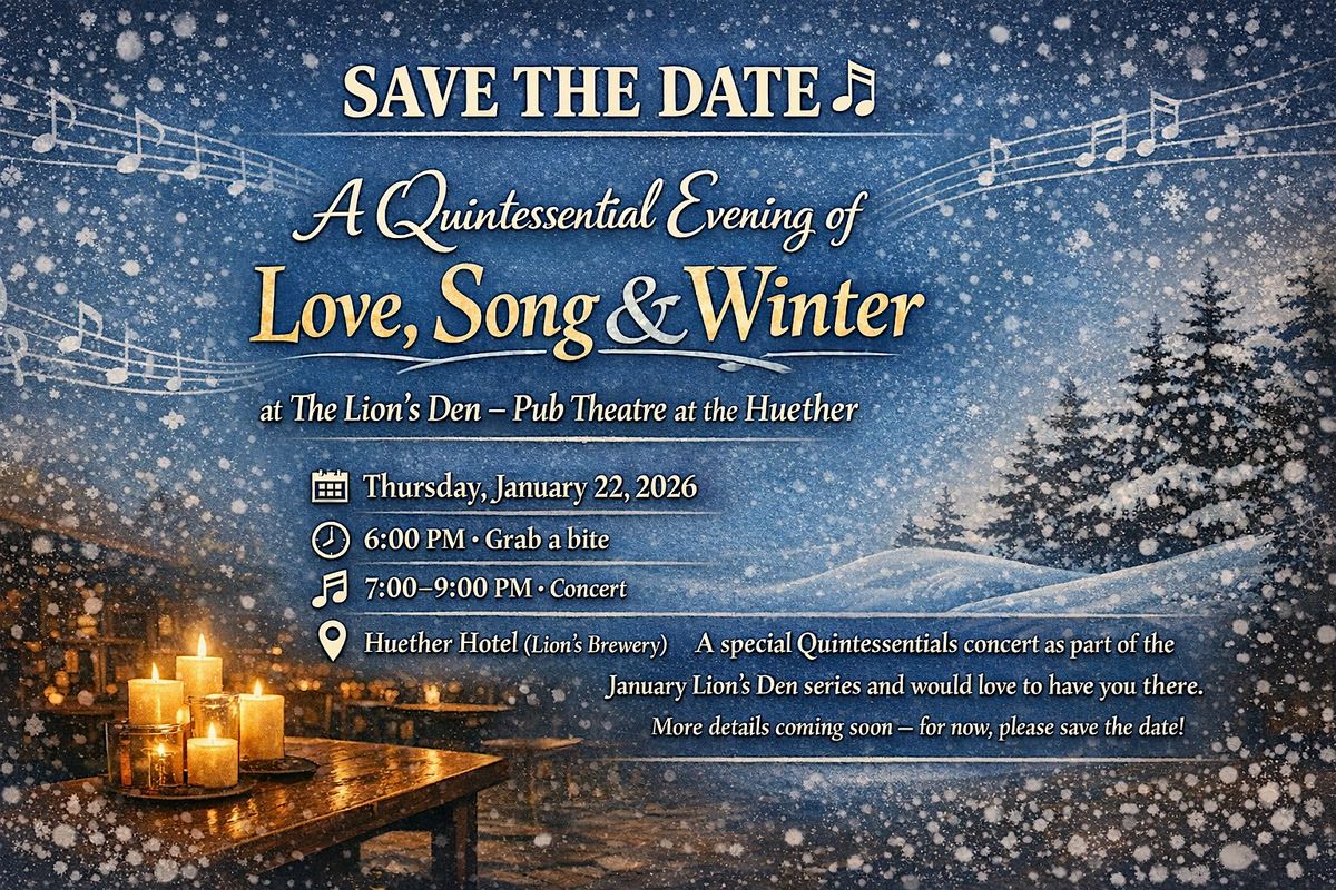 A Quintessential Evening of Love, Song & Winter is an intimate concert of close-harmony singing, storytelling, and seasonal reflection, presented by Waterloo’s own The Quintessentials: Armin Armbruster · Jonathan Cressman · Paul Hopkins - Geoff Vanderkooy · David Willms