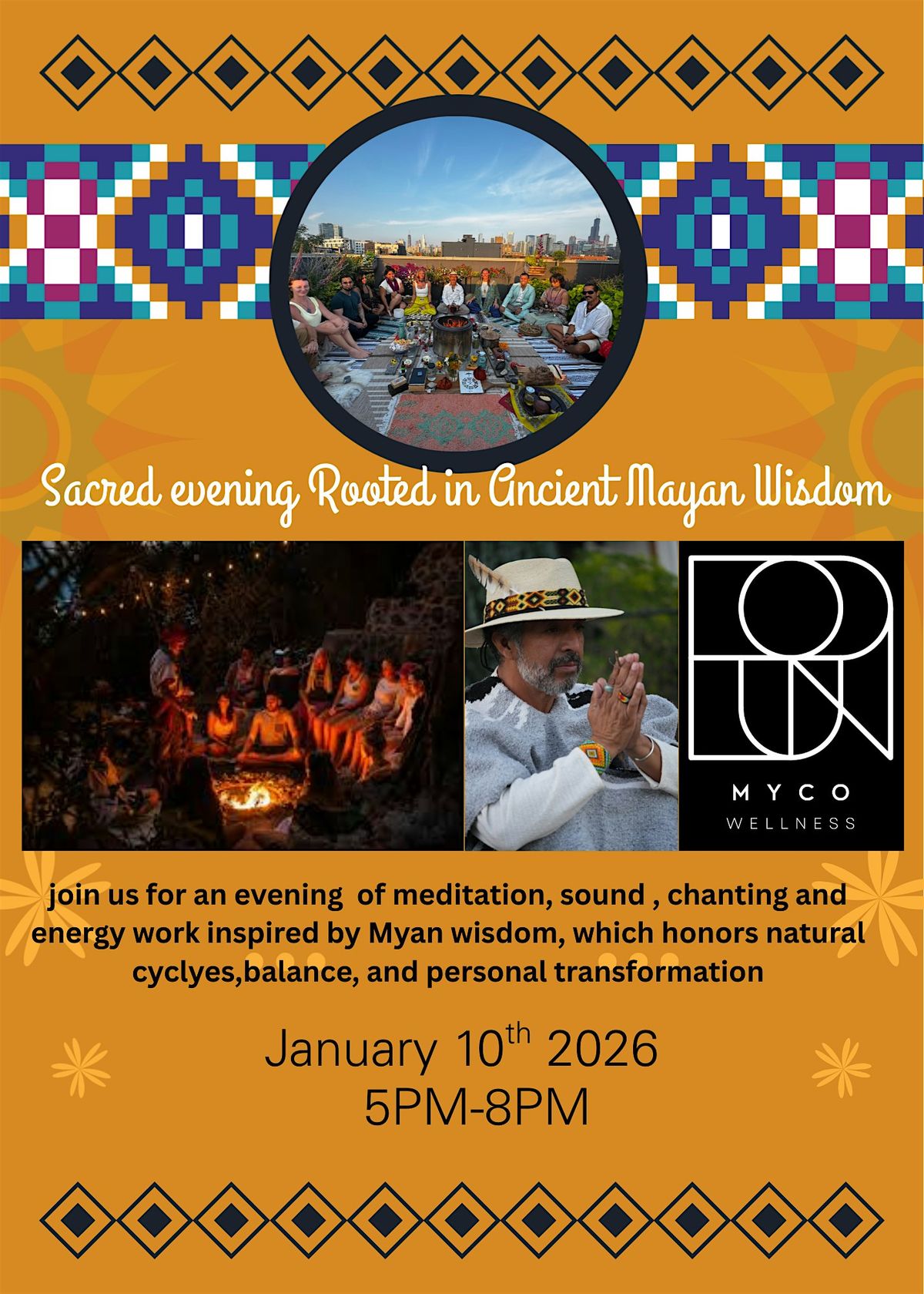 JOIN US FOR AN EVEING OF MEDITATION, SOUND,. CHANTING AND ENERGY WORK INSPIRED BY MAYAN WISDOM, WHICH HONORS NATURAL CYCLES, BALANCE