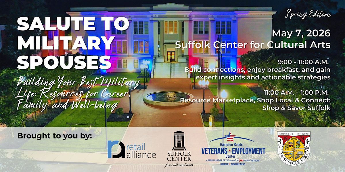 Join us for an exclusive day experience designed especially for our military spouses at the Suffolk Center for Cultural Arts! This exciting day out is all about celebrating and supporting you, the backbone of our military families. We understand the sacrifices you make and want to offer you a special day to enjoy the unique retail experience that Hampton Roads has to offer.