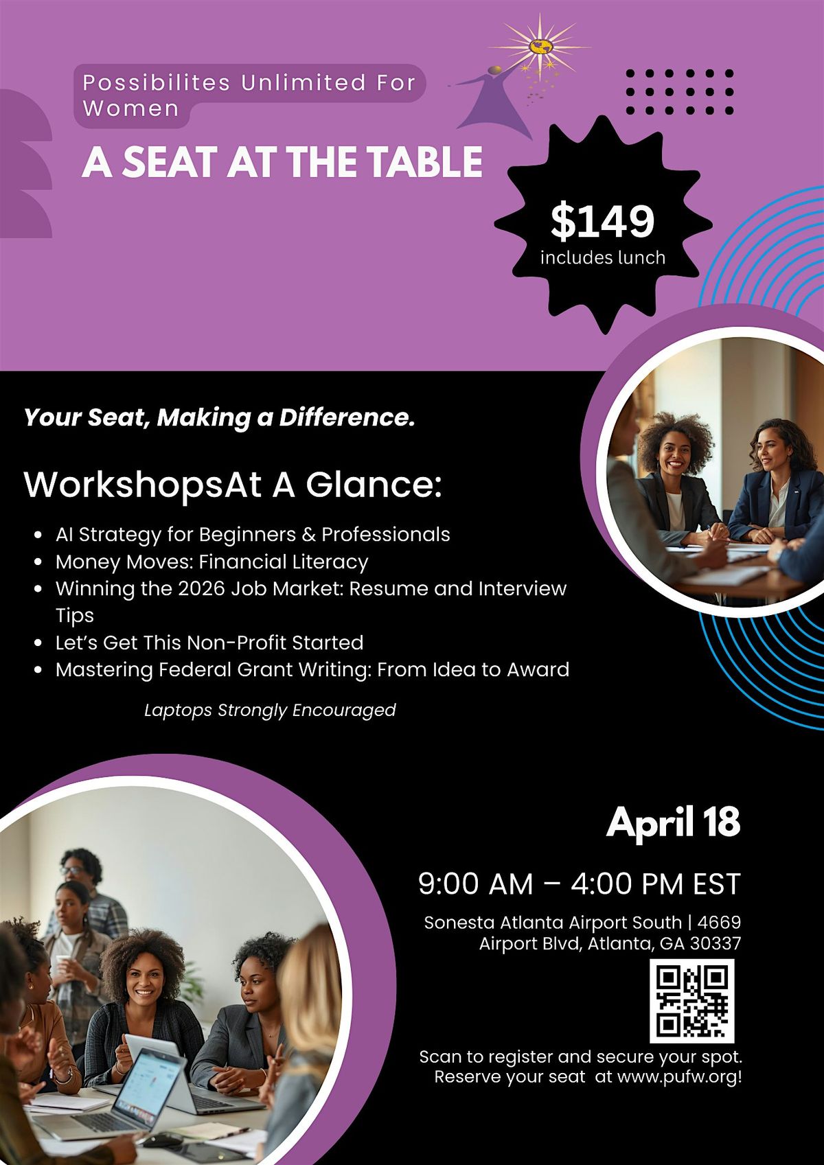 Join us for A Seat at the Table, a full-day workshop designed to equip participants with practical tools for career growth, financial empowerment, and leadership development while supporting an important cause.