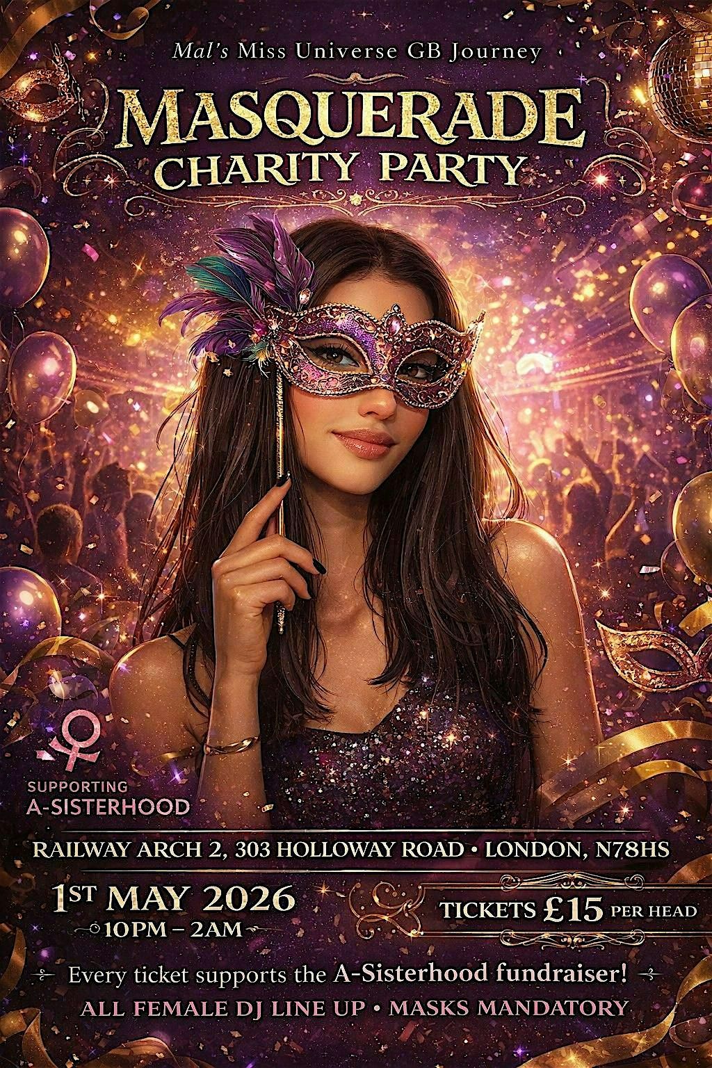 Join a glamorous masquerade party for my Miss Universe GB journey - limited spaces! All ticket funds go to A-Sisterhood charity.About this Event