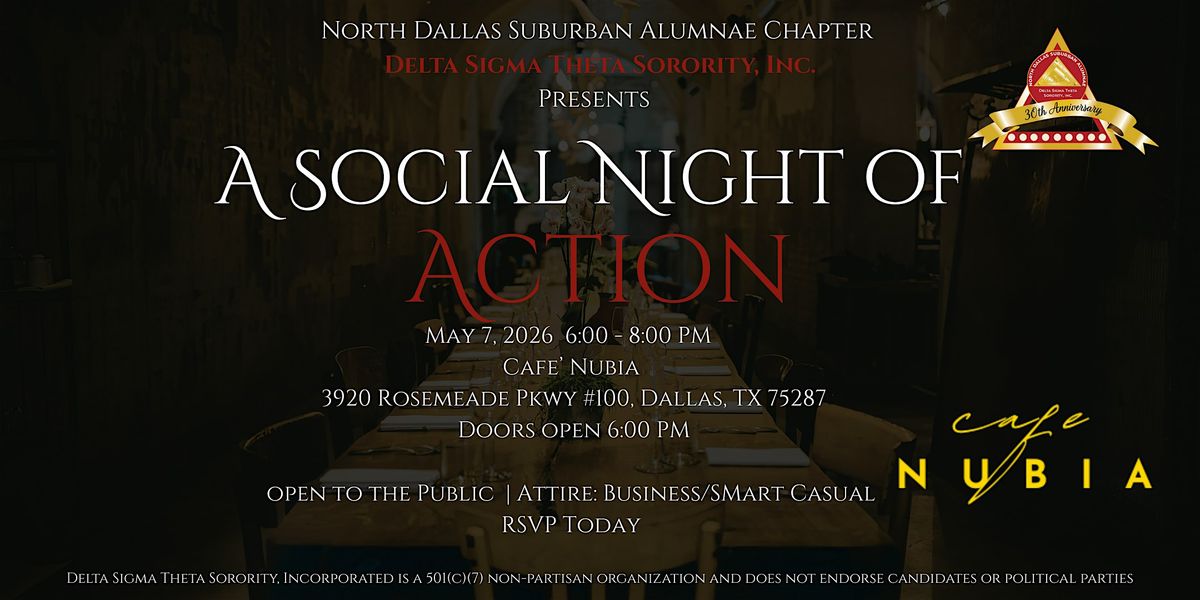 On behalf of the members of the North Dallas Suburban Alumnae Chapter of Delta Sigma Theta Sorority, Inc., we are honored to invite you to attend our May Week Social Action event, “A Night of Social Action.”