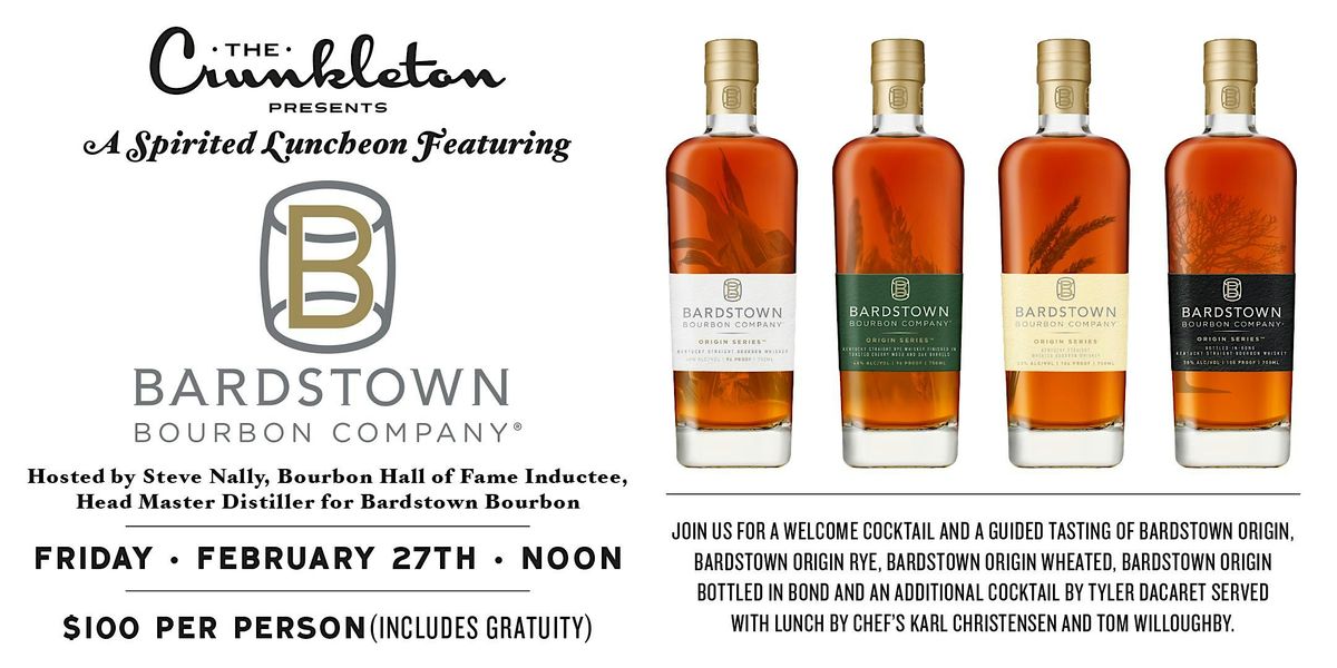 Join us for A Spirited Luncheon with Bardstown Bourbon. Start your afternoon off with a welcome cocktail, followed by a guided Bardstown Bourbon tasting led by Steve Nally (Bourbon Hall of Fame Inductee & Head Master Distiller for Bardstown Bourbon). Finally, enjoy a wonderful lunch prepared by Chefs Karl Christensen & Tom Willoughby, paired with an aditional cocktail by Tyler Dacaret.