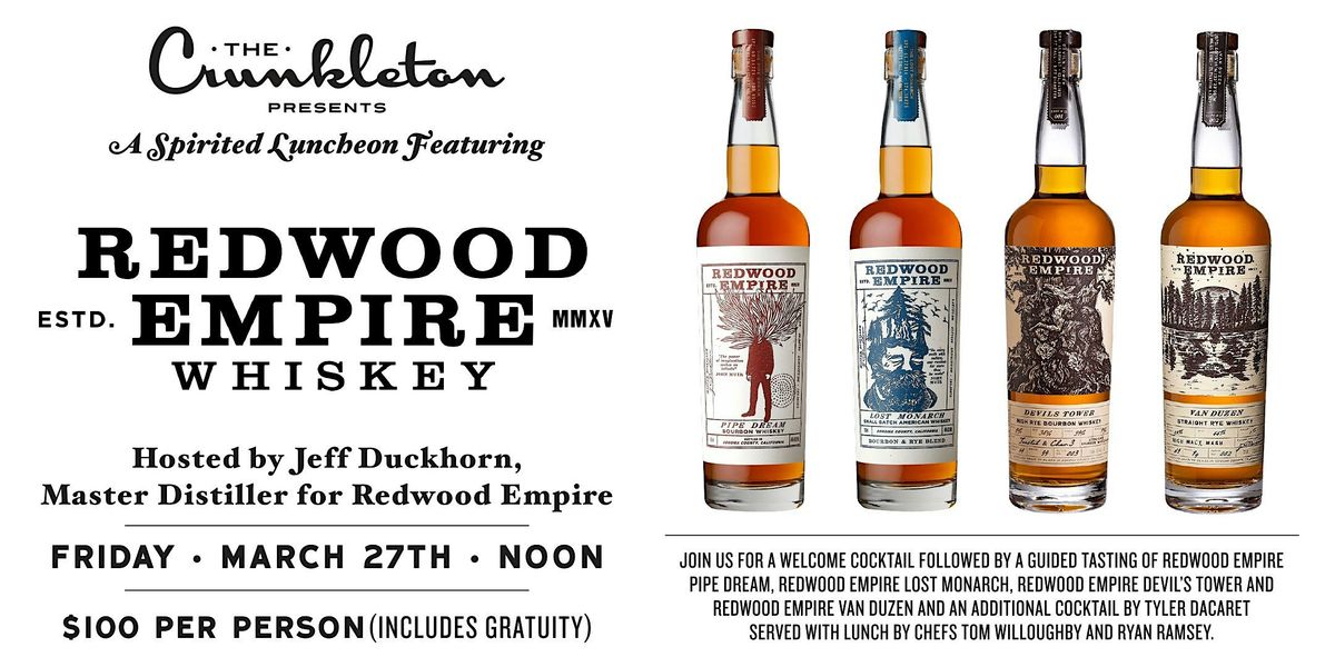 Join us for A Spirited Luncheon with Redwood Empire. Start your afternoon off with a welcome cocktail, followed by a guided Redwood Empire tasting led by Jeff Duckhorn (Redwood Empire Master Distiller). Finally, enjoy a wonderful lunch prepared by Chefs Tom Willoughby & Ryan Ramsey, paired with an aditional cocktail by Tyler Dacaret.