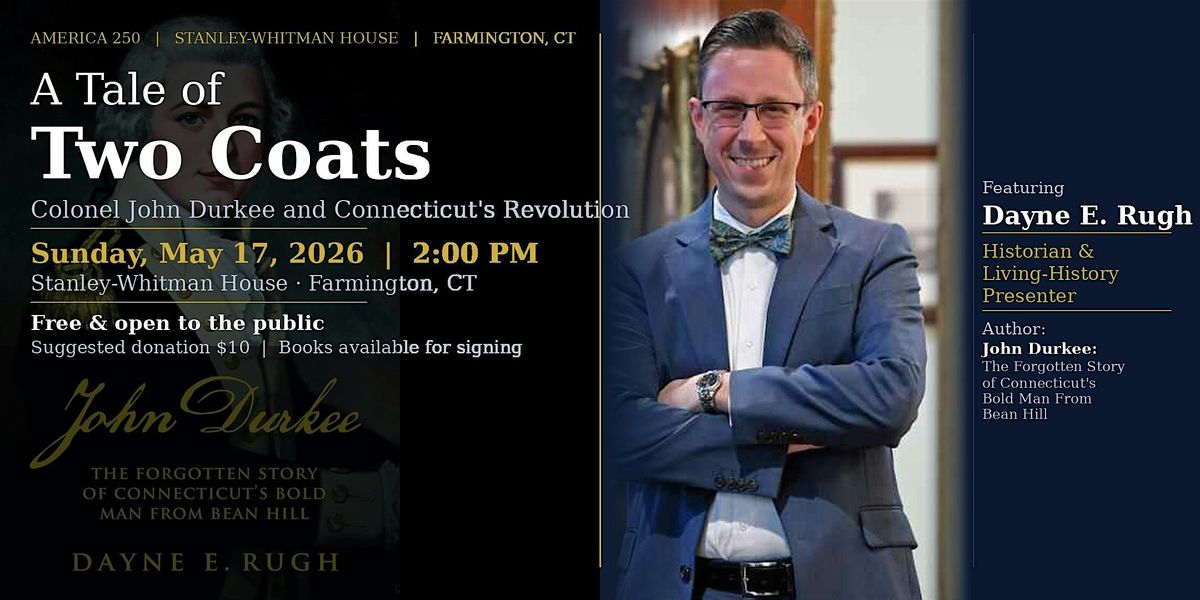 Join us at the Stanley-Whitman House on Sunday, May 17, at 2:00 PM for A Tale of Two Coats, a living-history presentation featuring historian and author Dayne Rugh as Colonel John Durkee — soldier, Son of Liberty, and one of Connecticut's most forgotten Revolutionary heroes.