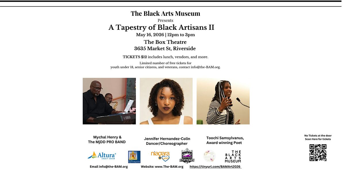 The Black Arts Museum presents A Tapestry of Black Artisans II at The Box Theatre in downtown Riverside, Saturday, May 16th from 12 noon to 3 p.m. Doors open at 11:30 a.m.