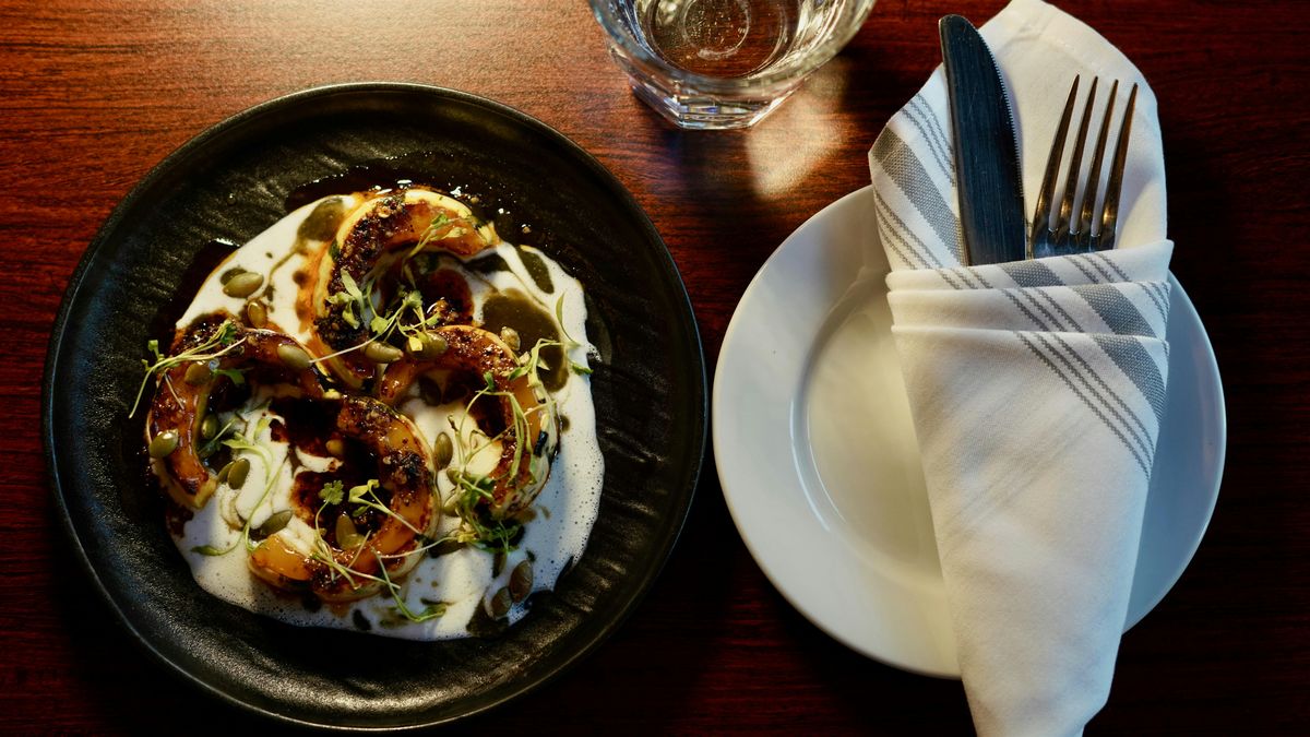 - Grilled Mosida Beef NY Strip: charred onion soubise, pickled apple, sautéed mountain greens, crispy garlic.