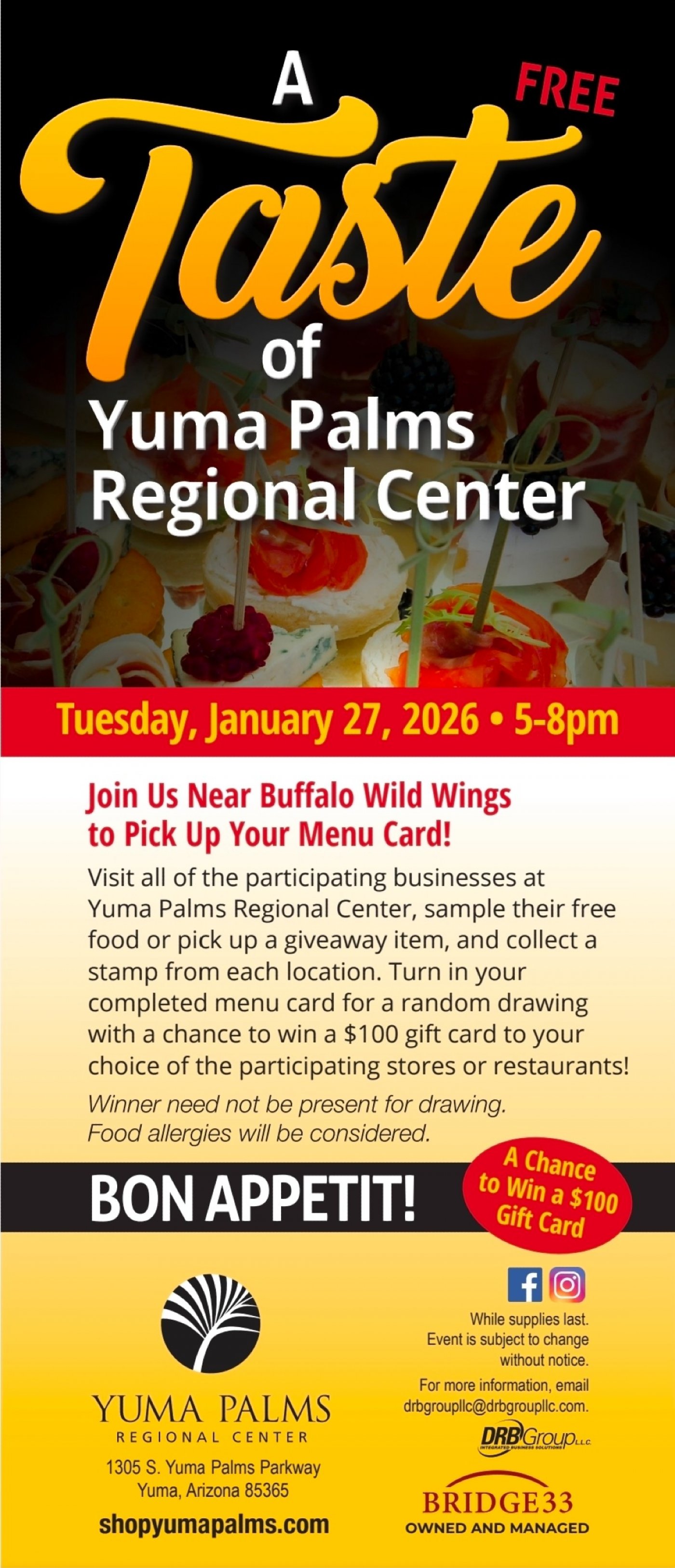 Join us and see what The Yuma Palms Regional Center has to offer! Pick up your menu card near Buffalo Wild Wings and sample free food and beverages, or pick up a giveaway item, from participating businesses in the center. Receive a stamp from each participating location as well to complete your menu card. Turn in your completed menu card for a chance to win a $100 gift card to your choice of the participating stores or restaurants!*