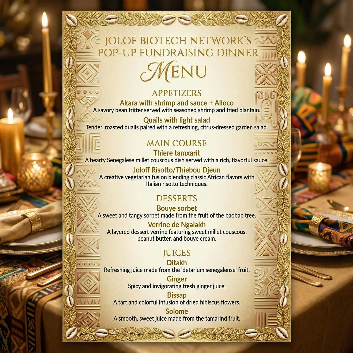 Immerse yourself in an evening of elegance, innovation, and purpose. Indulge in a meticulously crafted 5-course African fusion menu featuring modern interpretations of traditional flavors—from Joloff Risotto to Bouye sorbet—all accompanied by the soulful sounds of live Kora music. This is more than a dinner; it's a culinary journey that mirrors the innovative spirit we're cultivating.