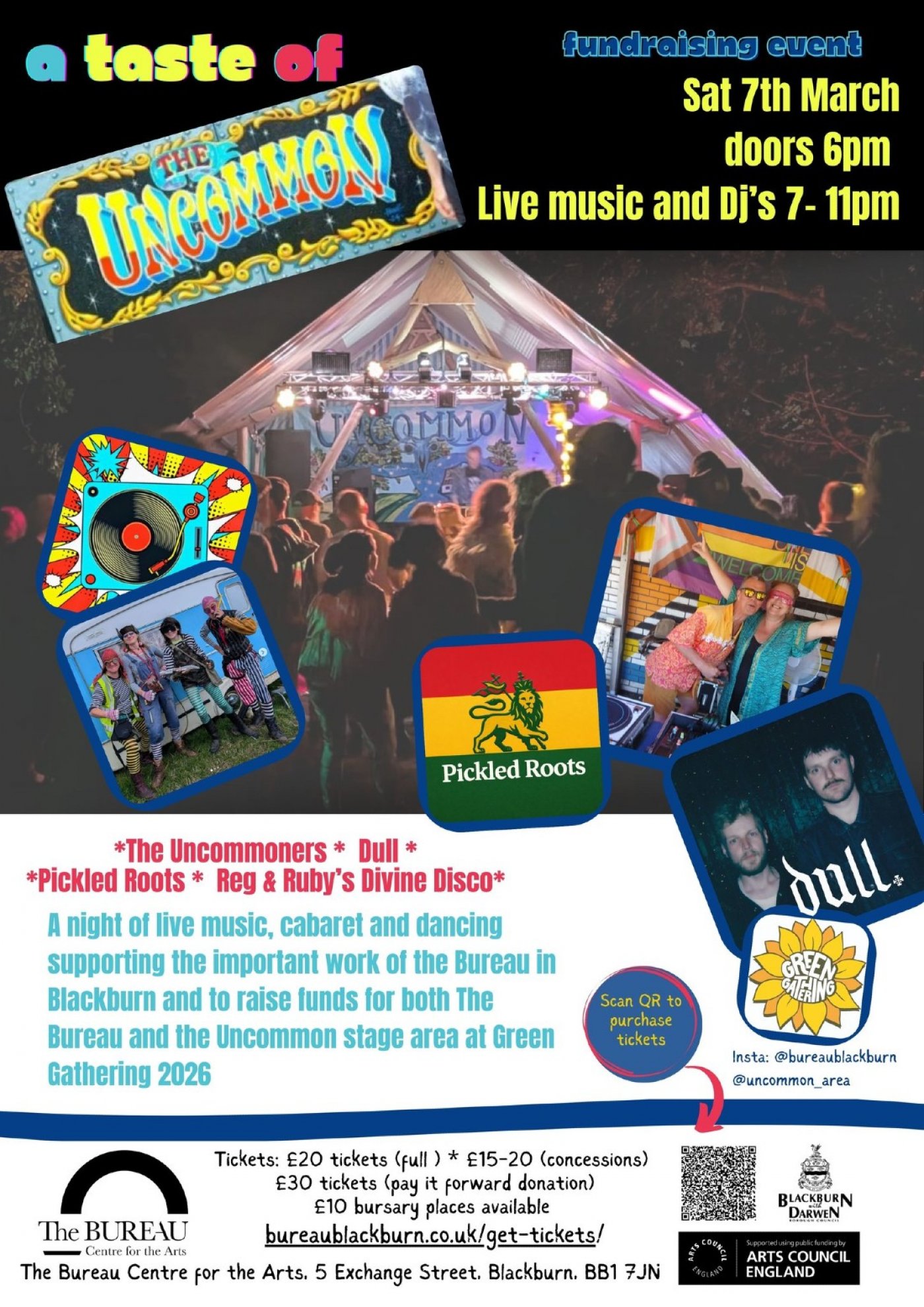 A night of live music, cabaret and dancing supporting the important work of the Bureau in Blackburn and to raise funds for Uncommon stage area at Green Gathering 2026