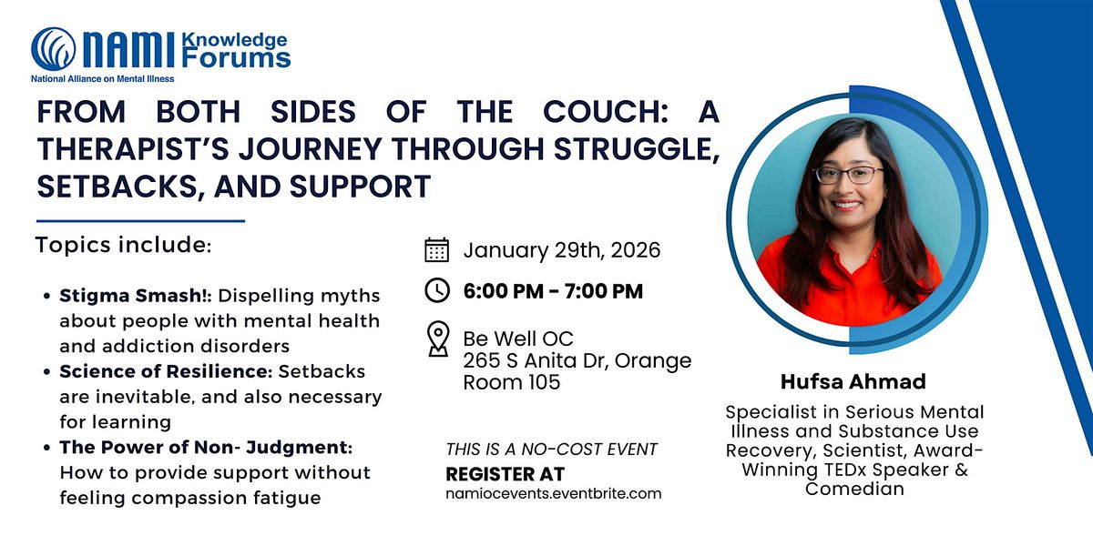 Join us for From Both Sides of the Couch: A Therapist's Journey through Struggle, Setbacks, and Support, a powerful and heartfelt Knowledge Forum featuring Hufsa Ahmad - Clinical Therapist, TEDx speaker, scientist, and comedian. Drawing from her unique experience as both a therapist and someone who has personally navigated mental health challenges, Hufsa offers an honest, uplifting look at what it means to struggle, to grow, and to support others with compassion. She’ll break down common myths around mental health and addiction, explore the science behind resilience, and share practical tools for offering non‑judgmental support without burning out. Whether you’re a family member, peer, provider, student, or simply someone who wants to better understand mental health, this conversation promises insight, connection, and encouragement. Come be part of an event that builds empathy, challenges stigma, and reminds us that healing is a journey we don’t walk alone.