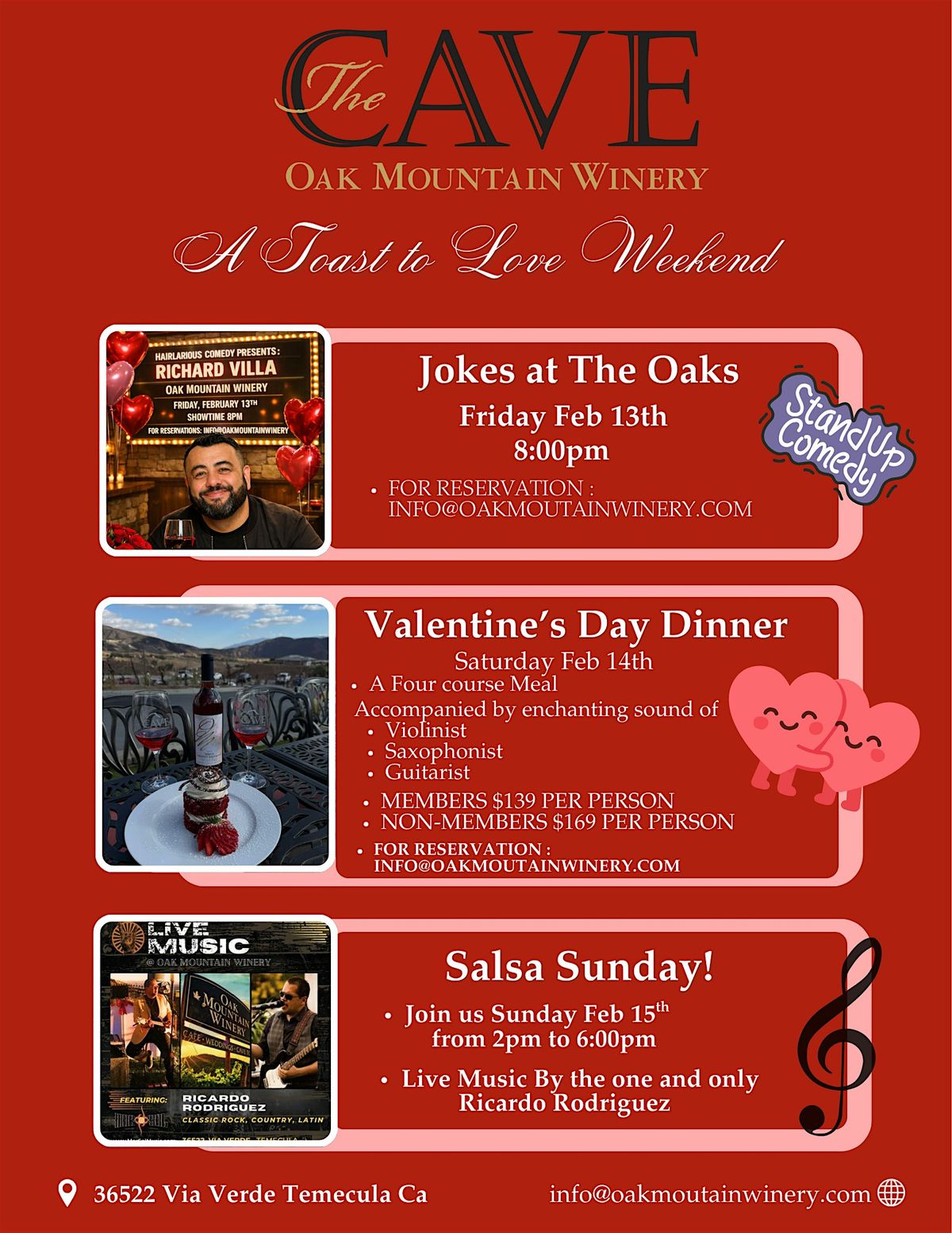 Jokes at The Oaks Friday 2/13, Valentines Day Dinner Saturday 2/14, Salsa Sunday 2/15