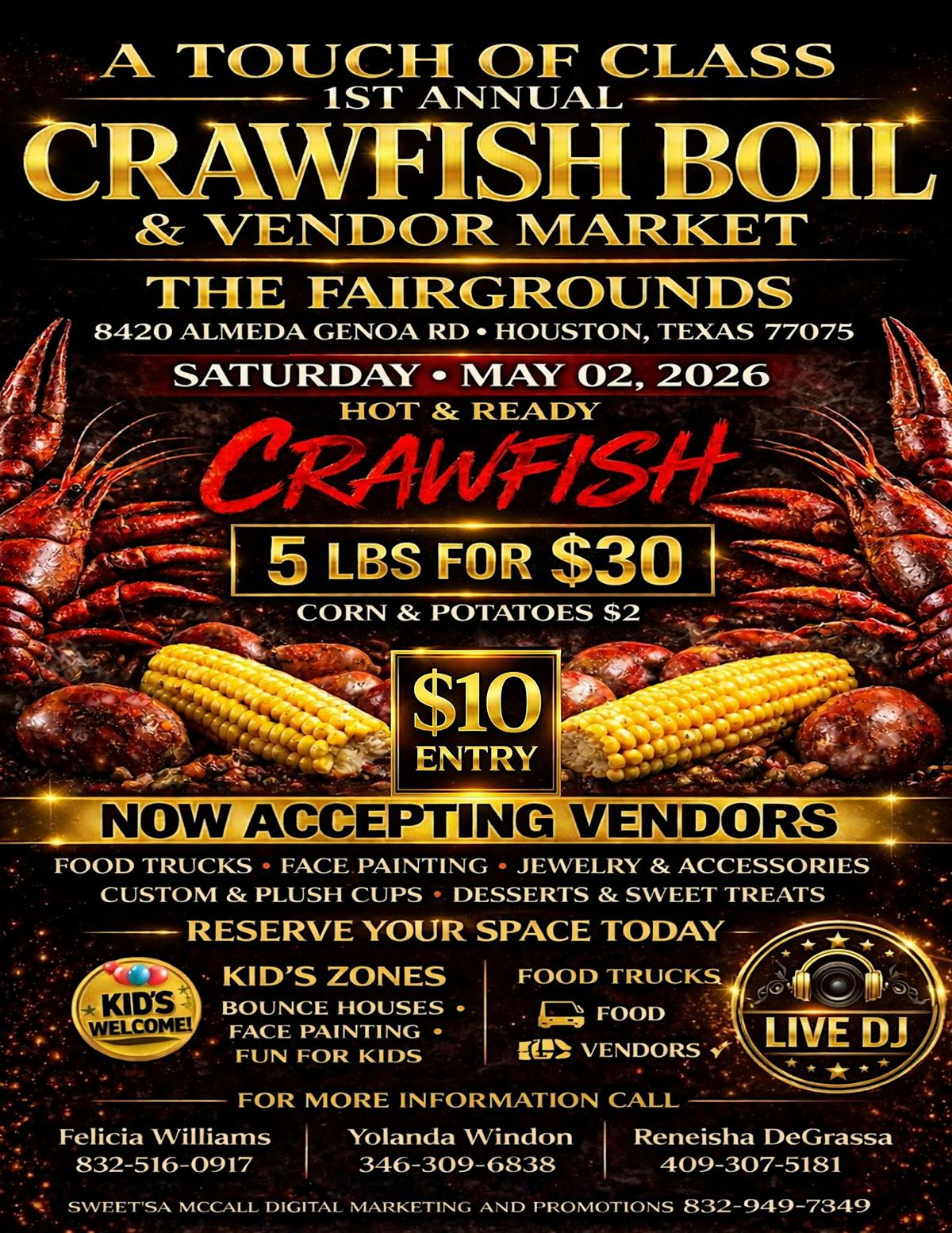 Get ready to dig into some spicy crawfish & shop cool local vendors at this fun, laid-back boil & market! May 2, 2026! Doors open @ 10am!
