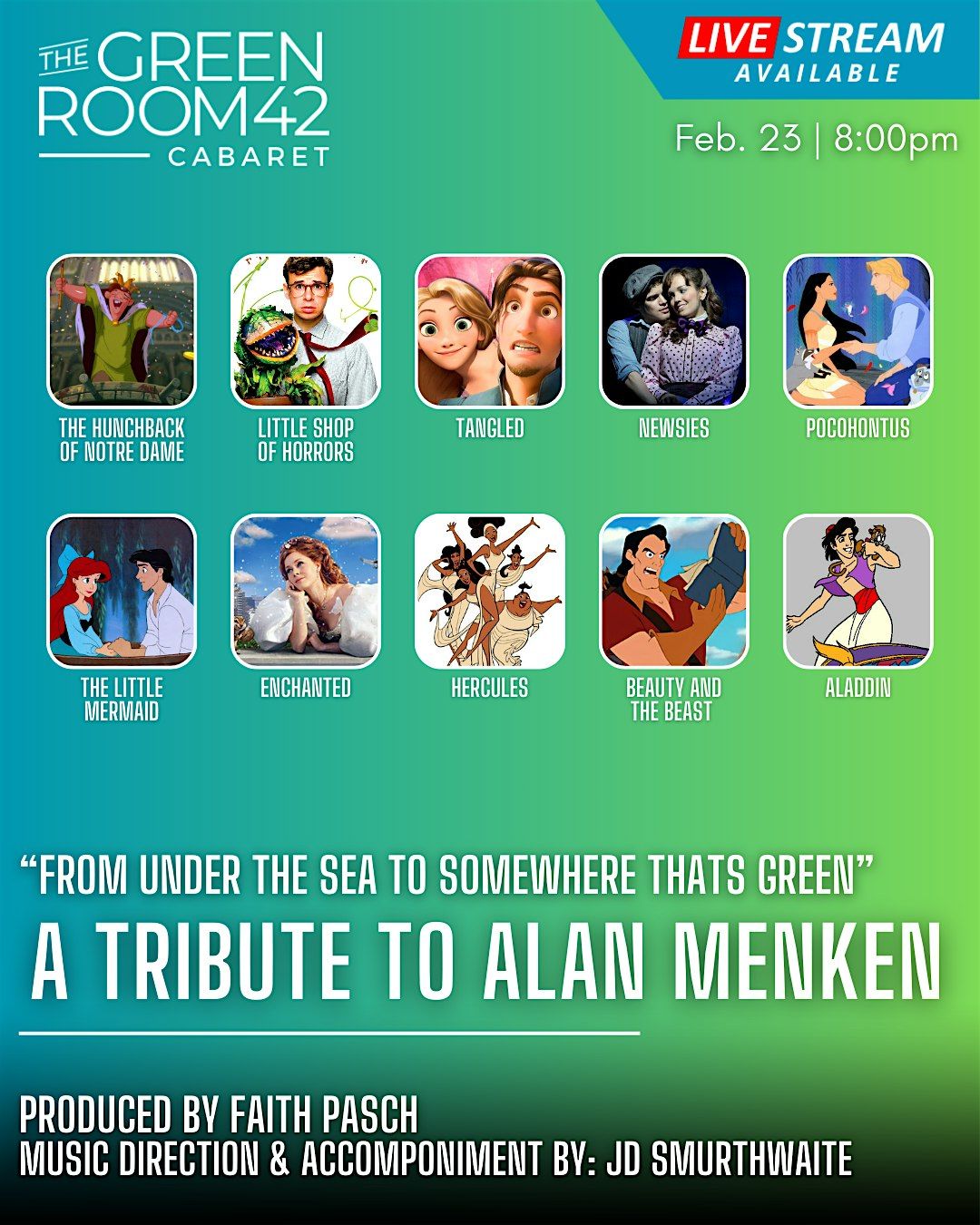 Join us at The Green Fig Supper Club for a joyful tribute to the music of Alan Menken. Featuring beloved songs from films like Aladdin, Tangled, The Little Mermaid, Hercules, and The Hunchback of Notre Dame, alongside iconic theatrical works including Little Shop of Horrors, Newsies, and Sister Act. Led by a diverse cast, the evening blends classic melodies we all know and love with reimagined 90s R&B–inspired versions. Come under the sea or to somewhere thatʼs green, and let us sing to the inner child in you.