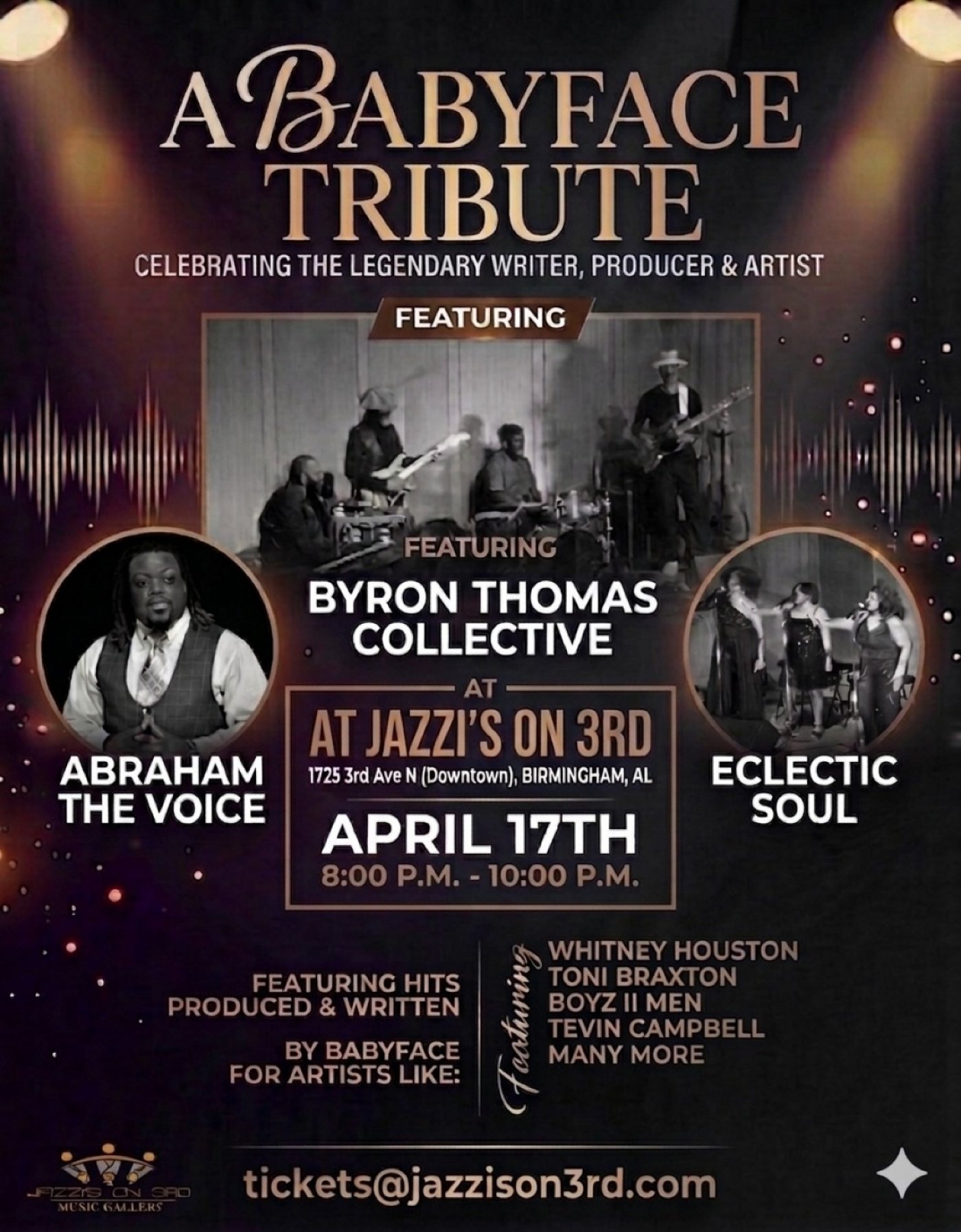 Join us for a magical night celebrating the legendary Babyface brought to you by the incomparable BT Collective, Eclectic Soul and Abraham the Voice! Experience his timeless hits from a broad array of artist including Toni Braxton, Whitney Houston, Tevin Campbell, Bobby Brown, Madonna and so many more. Timeless hits like Whip Appeal, Can We Talk, Rock Steady are among the list of hits featured in this phenominal live performance. Whether you're a longtime fan or new to his music, this is the perfect chance to vibe with soulful melodies and great company. Don't miss out on this amazing tribute event—honoring the man behind the music while experiencing an unforgettable night of entertainment!