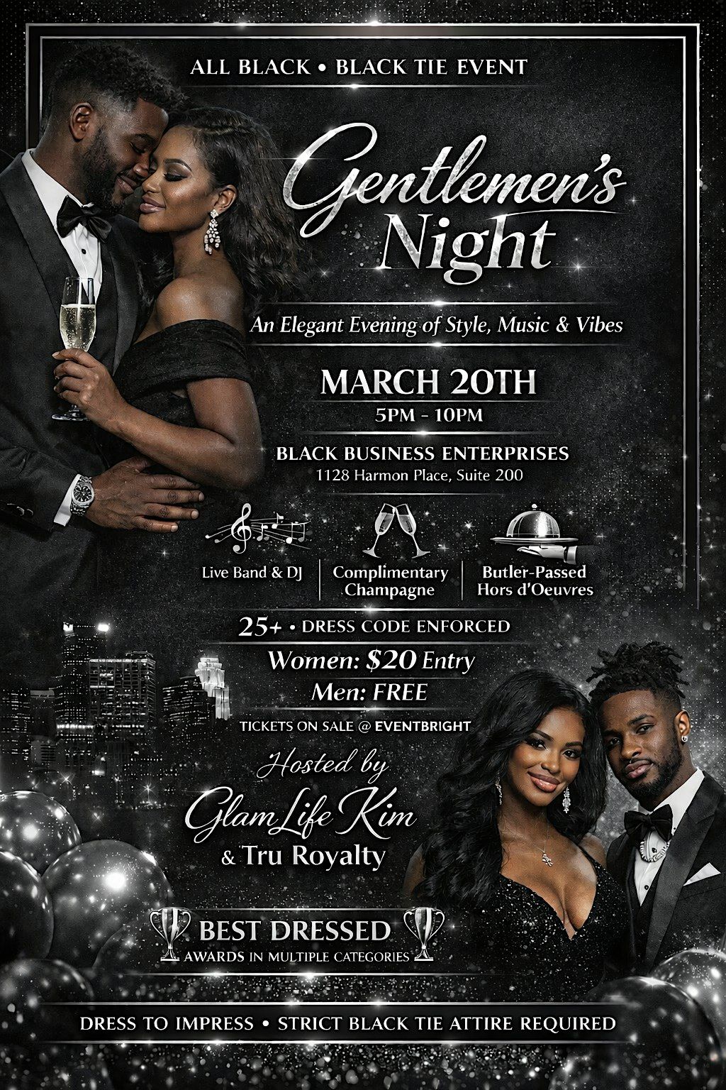 All Black Black Tie Gentlemen's Night, Women come in your best $20 entrance and men in free march 20th at the black business enterprises 1128 Harmon Place suite 200 5pm til 10 pm , live band /DJ, complimentary champagne, butler pass hors d’oeuvres, cash bar hosted by Tru Royalty & Glam life Kim with a few Surprise guests.