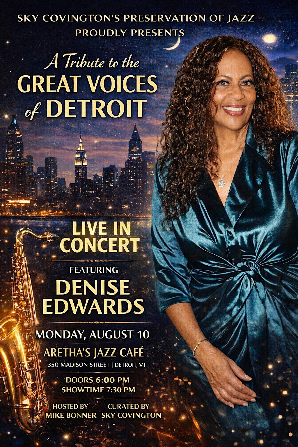 Join us in person for an unforgettable night celebrating the soul and spirit of Detroit's legendary singers. Denise Edwards will take the stage to honor these iconic voices in a heartfelt performance that’ll have you singing along. It’s the perfect chance to experience the magic of Detroit’s music scene up close and personal. Come vibe with us and celebrate some truly great voices!