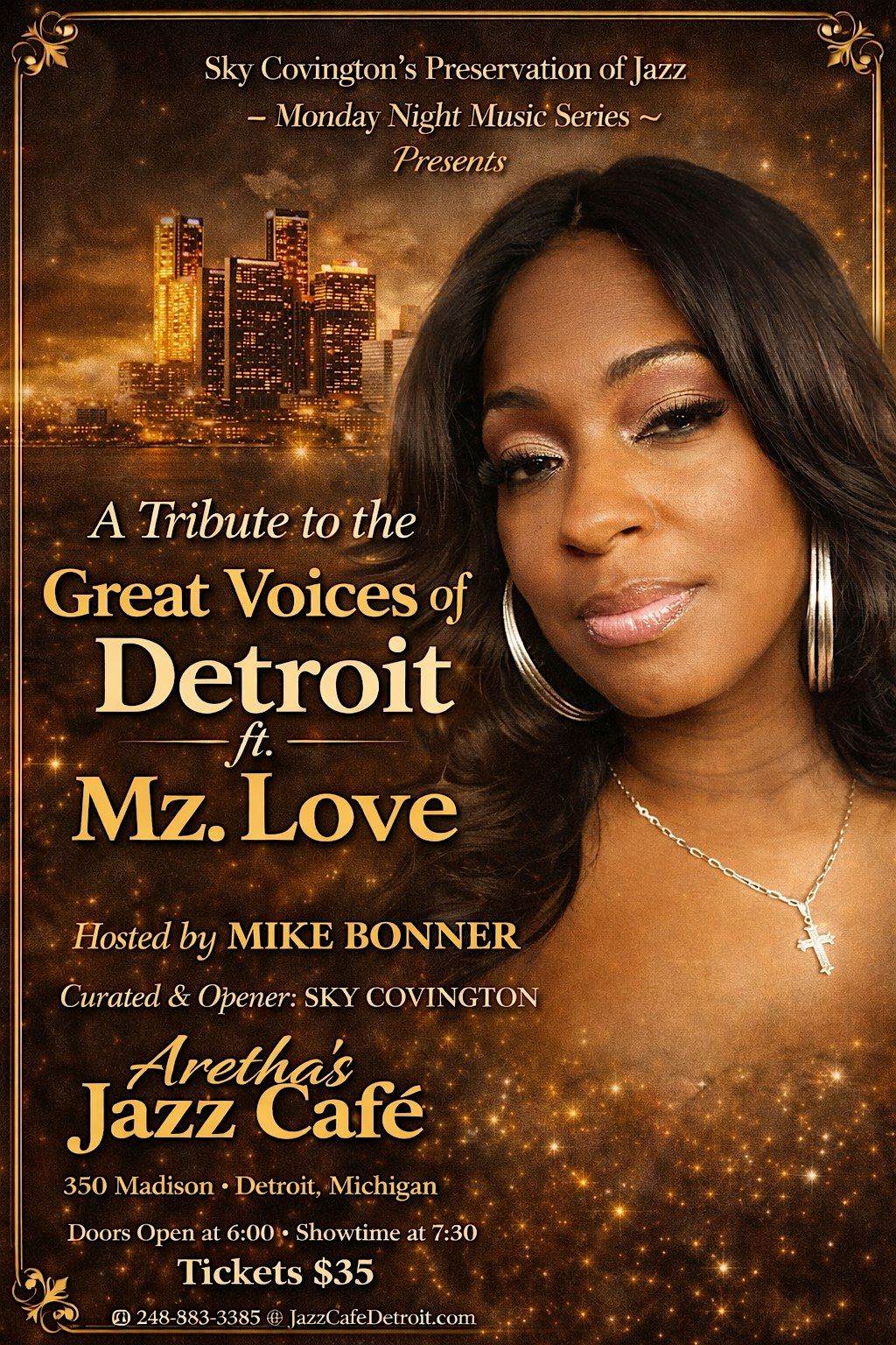 Detroit, MI — The Preservation of Jazz proudly presents A Tribute to the Great Voices of Detroit, an unforgettable evening celebrating the powerhouse vocal tradition that has made Detroit one of the most influential music cities in the world. This special tribute features the dynamic and soulful Mz. Love, whose voice and artistry span generations of sound from the 1970s to the present day.