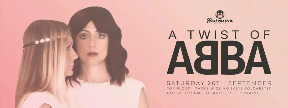 A Twist of ABBA are the ultimate Agnetha and Frida duo. Highly regarded for their stunning harmonies and attention to detail in bringing the songs, performances and outfits of their musical heroes to life. On Saturday 26th September, hear ALL the greatest songs of ABBA played live as they were always meant to be. £15 advance (+ booking fee)Doors 7:30pmOver 18s only This gig takes place on the top floor of Three Wise Monkeys Colchester Access – There is no lift to access the top floor of Three Wise Monkeys. There are flights of hand railed stairs to reach the top floor with rest opportunities between each flight
