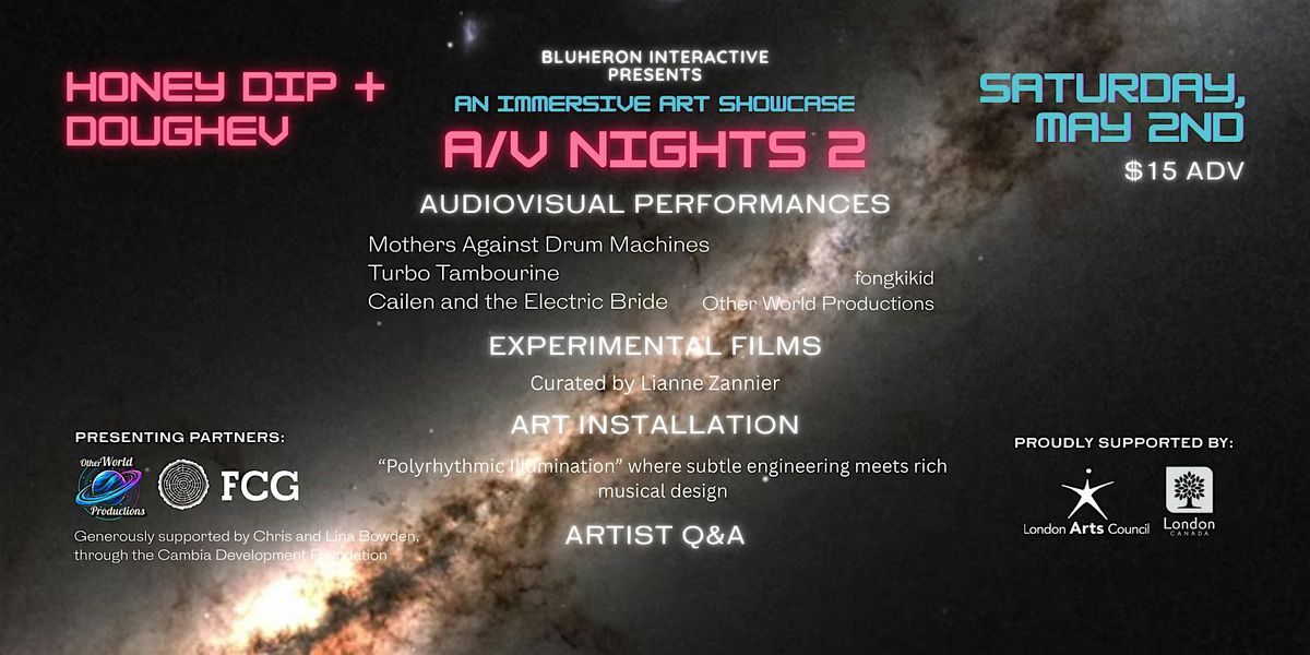 A/V Nights 2 is a fundraiser for Forest City Gallery, supported by the London Arts Council and the Cambia Development Foundation.