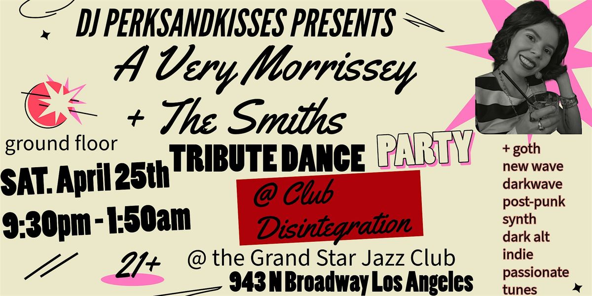 On Saturday, April 25th, DJ perksandkisses hosts Club Disintegration, the dark & dreamy danse gala @ the Grand Star Jazz Club in Chinatown, Los Ángeles. Ground floor. This edition will be a dance tribute to Morrissey & the Smiths.